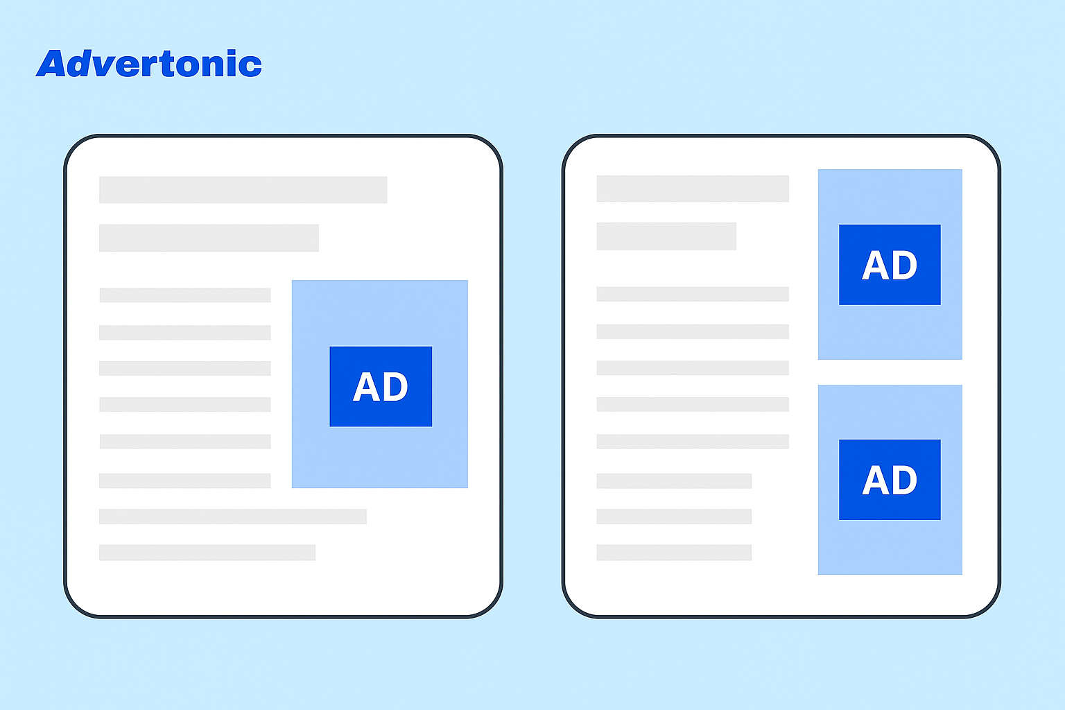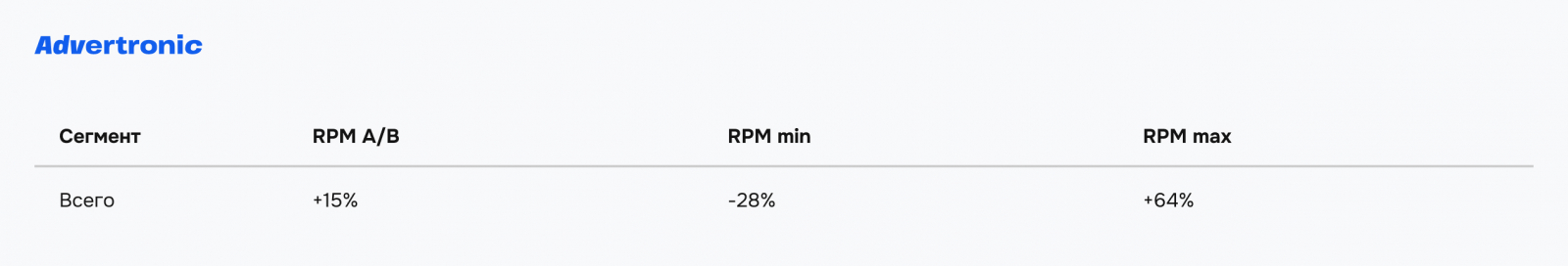 С мая по сентябрь 2025 года Advertronic протестировал конфигурации на 17 сайтах (тематических и информационных). Трафик распределялся поровну: 50% — на один крупный блок, 50% — на несколько небольших. В среднем вариант с несколькими маленькими блоками обеспечил прирост дохода на 15%. Максимальный рост +64%, как его добиться, расскажем чуть ниже.