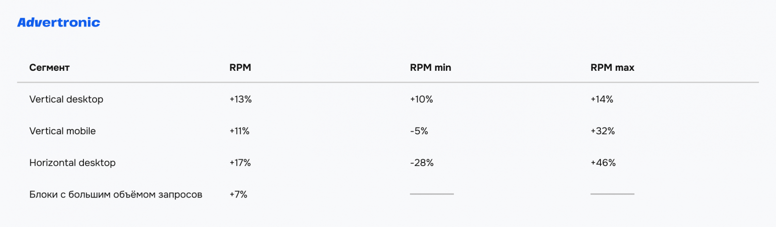 С Advertronic сайты зарабывают больше, а паблишеры экономят время и ресурсы. Чтобы узнать подробности сотрудничества , оставляйте заявку на сайте.