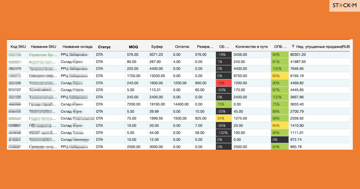 Проверку начинаем с топ-позиций из отчёта. Нас интересуют случаи, где: заказы уменьшали вручную, отказались от рекомендованного роста буфера, принудительно понизили уровень запасов или не отправили заказ вовсе. Во время обучения команда StockM проводит такую проверку совместно с клиентом, чтобы помочь и поддержать в новой системе. В дальнейшем изменение буферов или отправку заказов можно автоматизировать.