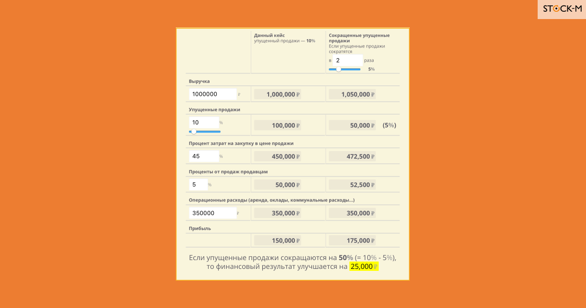 В StockM есть калькулятор, который поможет оценить потерянную прибыль. Для примера мы подставили значения из своего кейса: сокращение упущенных продаж всего в два раза увеличивает прибыль на 16%.