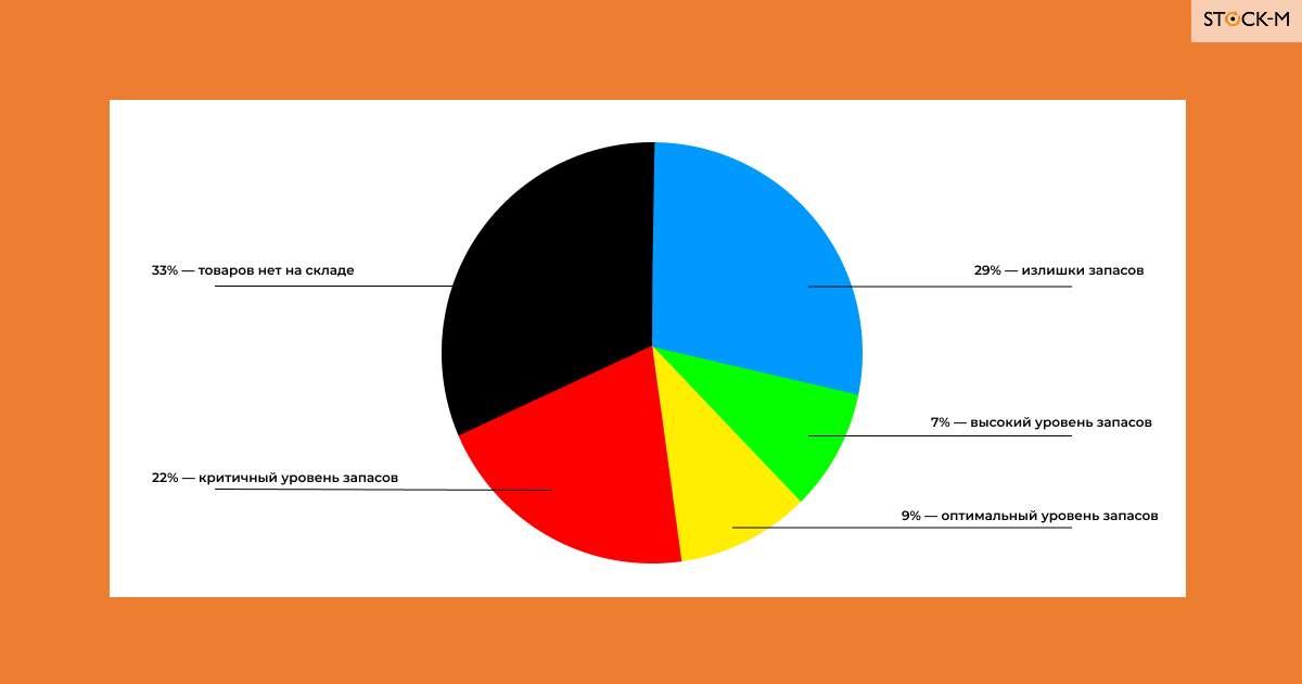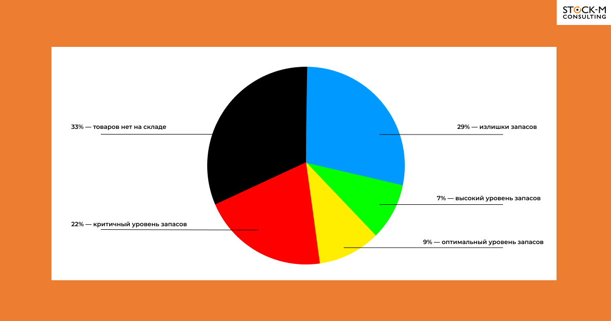 Синим цветом светились излишки — по 29% ассортимента запасы были выше буфера. Излишки заморозили миллионы рублей, которые могли работать, а не просто лежать на складе.