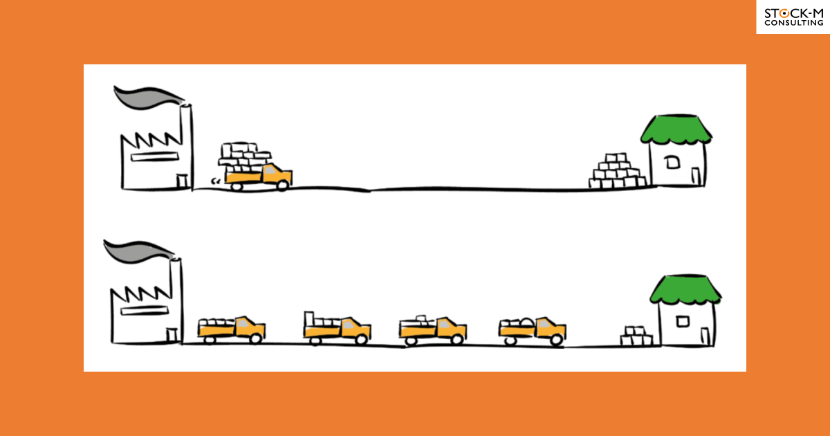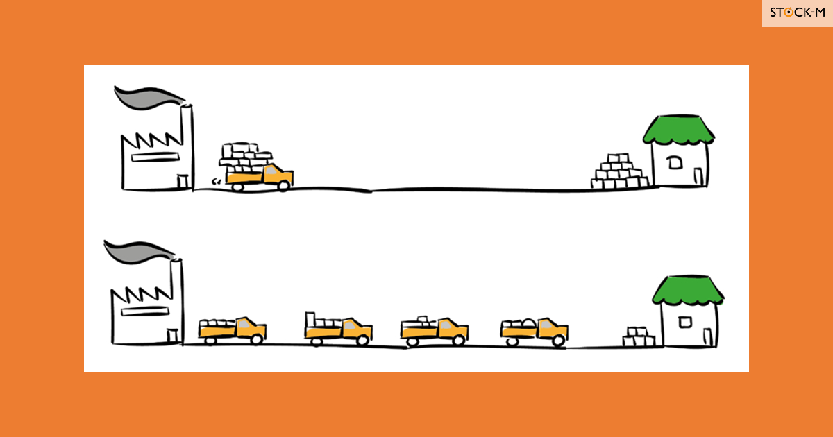 Представьте две схемы поставок. Сверху — одна большая машина в месяц. Снизу — четыре небольшие поставки в течение того же месяца.