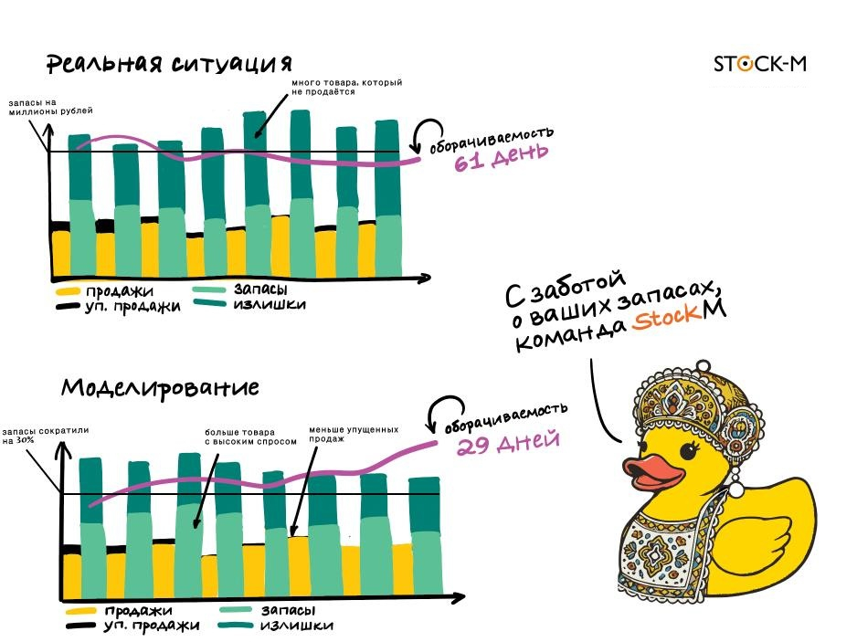 И поговорили с ним добры девицы в нарядах скромных, но достойных, да предложили провести моделирование. Услугу такую, в которой запасы уточек пересчитают с учётом реальных продаж и заказов по буферу и покажут, сколько денег получится достать из «замороженных» запасов уточек и насколько «Царская утка» может сократить упущенные продажи.