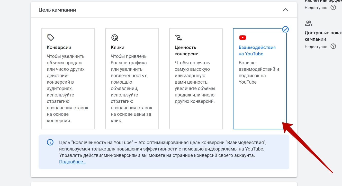 2. при создании кампании мы выбираем "взаимодействия на YouTube"
