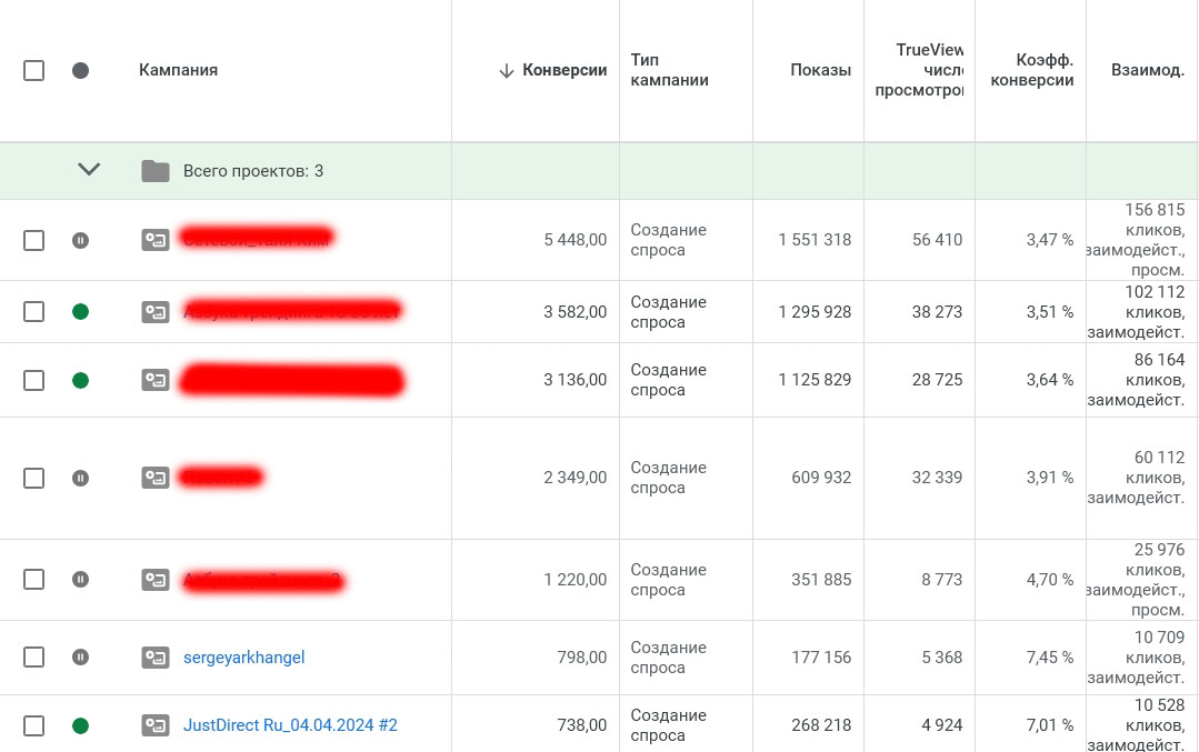 На скриншоте выше я показал некоторые кампании. К сожалению по некоторым клиентам у меня подписано договор о неразглашении и поэтому я не могу показать названия кампаний.