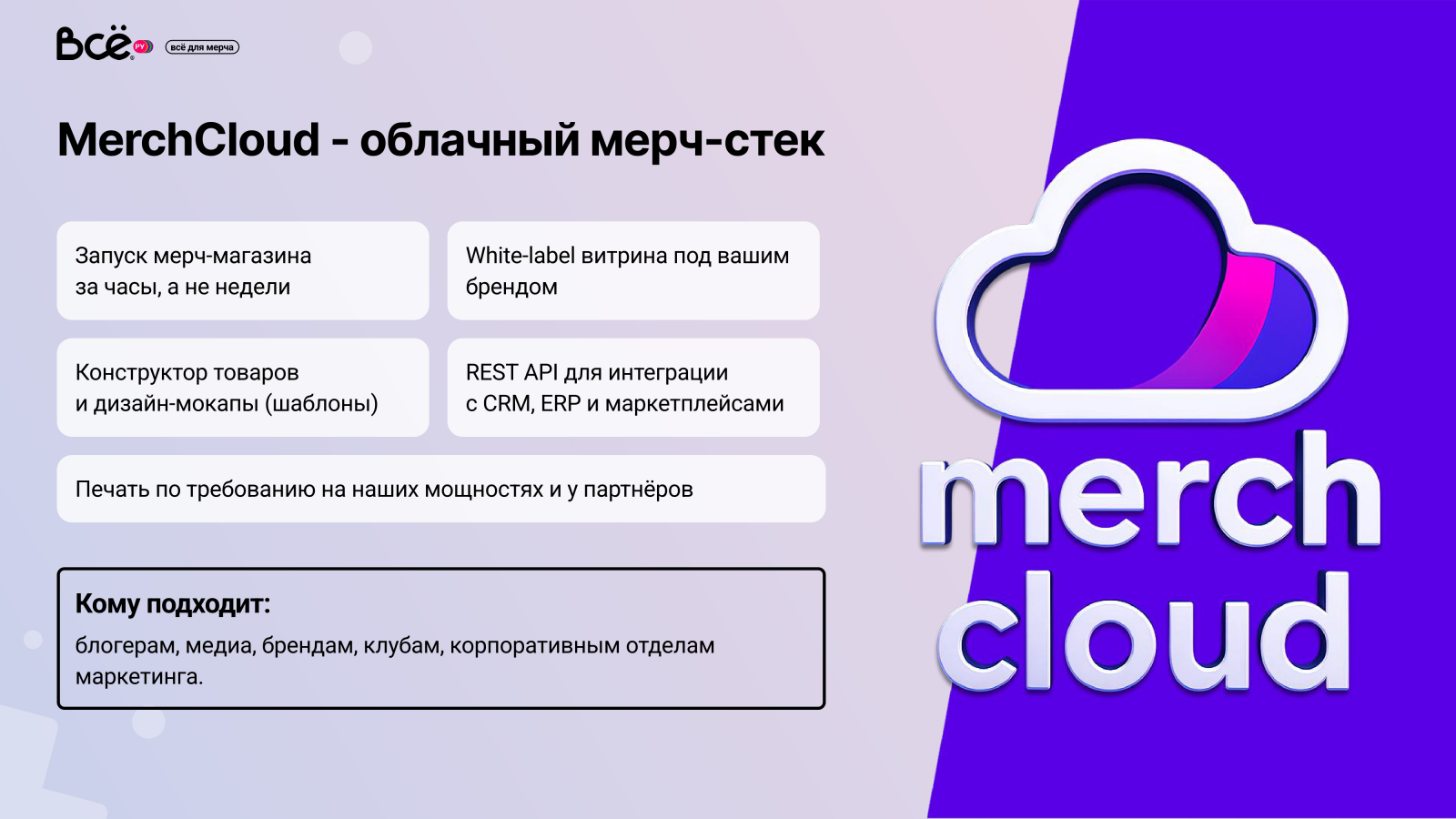 MerchCloud — это технологическая возможность создать для компании персональный мерч-шоп на платформе Vse.ru (white-label витрина). На такую витрину партнеры могут загрузить кастомизированные дизайны, а HR и сотрудники могут самостоятельно оформлять заказы «когда нужно», без отдельных брифов. Шоп можно запустить за 1 день, производство заказов — от 2 дней. Для тех, кому нужен разовый корпоративный заказ или партия с кастомным дизайном, закупка доступна напрямую на Vse.ru.
