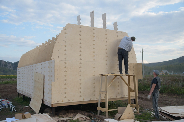 Этап 3: Обшивка В воскресенье мы занялись заполнением ячеек каркаса. В качестве стеновых панелей использовали тот же листовой материал из фанеры, а для кровли — лёгкий прозрачный поликарбонат, . В полдень мы уже закрывали последнюю панель.