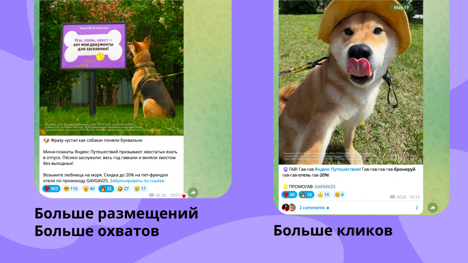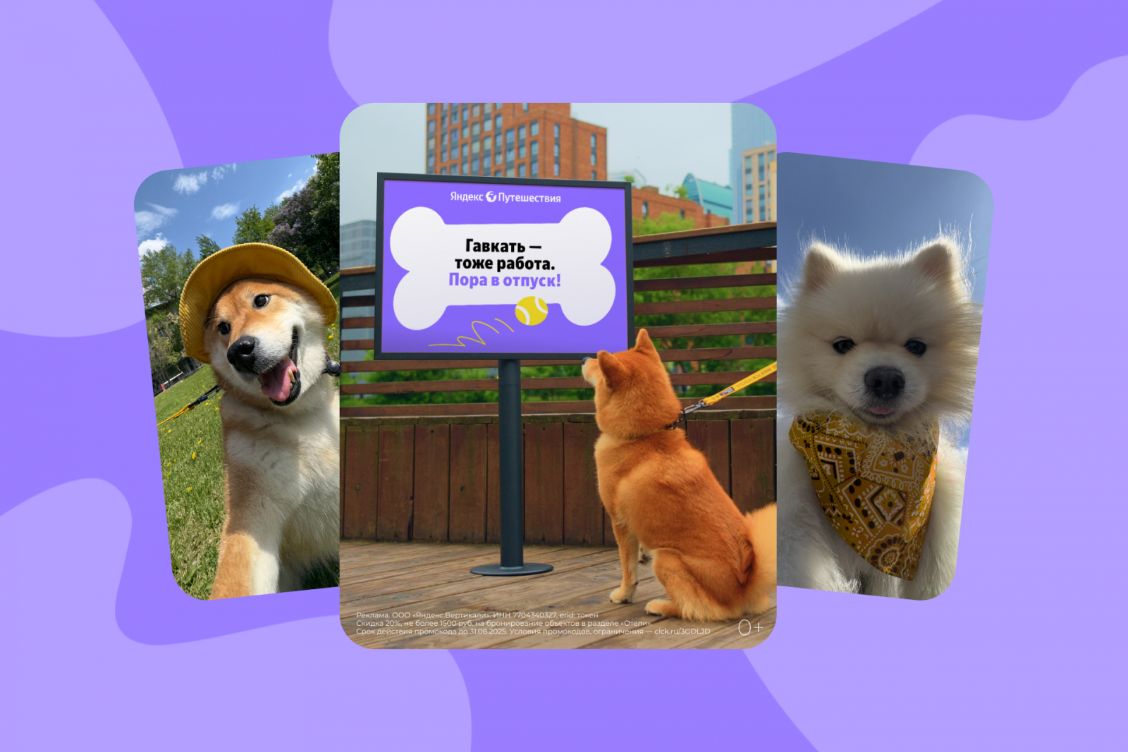 Рекламная кампания «Гав Гав» — моя любимая в 2025 году. Путешествия с собаками должны быть комфортными, а Яндекс Путешествия помогут с этим. Мы довольны результатами кампании.