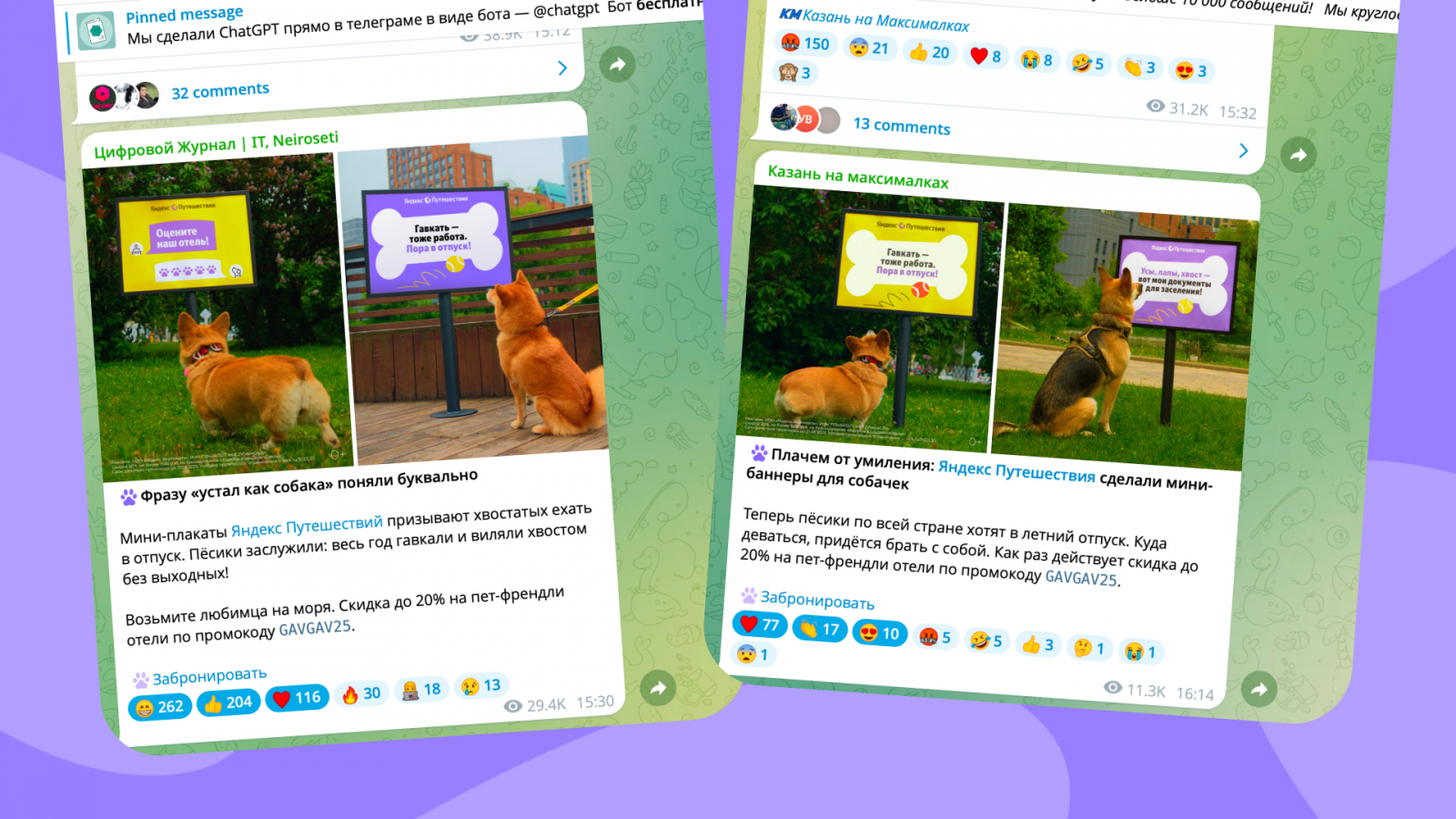 Окей, баннеры мы сделали как будто для собак, но дальше в рекламе был обычный «человеческий» текст. А вот для второй части кампании мы представили, какие посты и истории публиковали бы собаки, если поехали в отпуск сами, без хозяев.