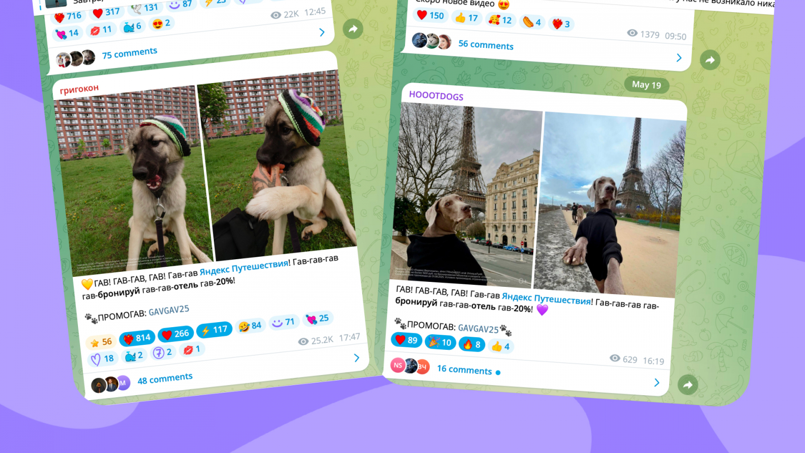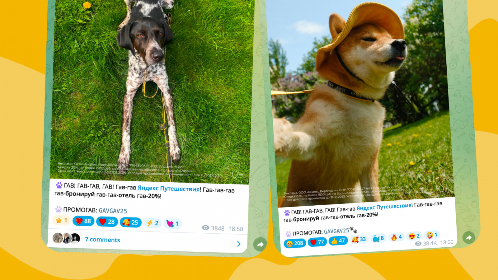 Мы запустили серию посевов, которые состояли только из слов «Гав» и «Гав-гав». Это была реклама «от собак и для собак» с фотографиями пёсиков в типичных позах туристов на отдыхе. Ведь питомцы тоже готовы к путешествиям, отпускным фотосессиям и лучшим воспоминаниям!