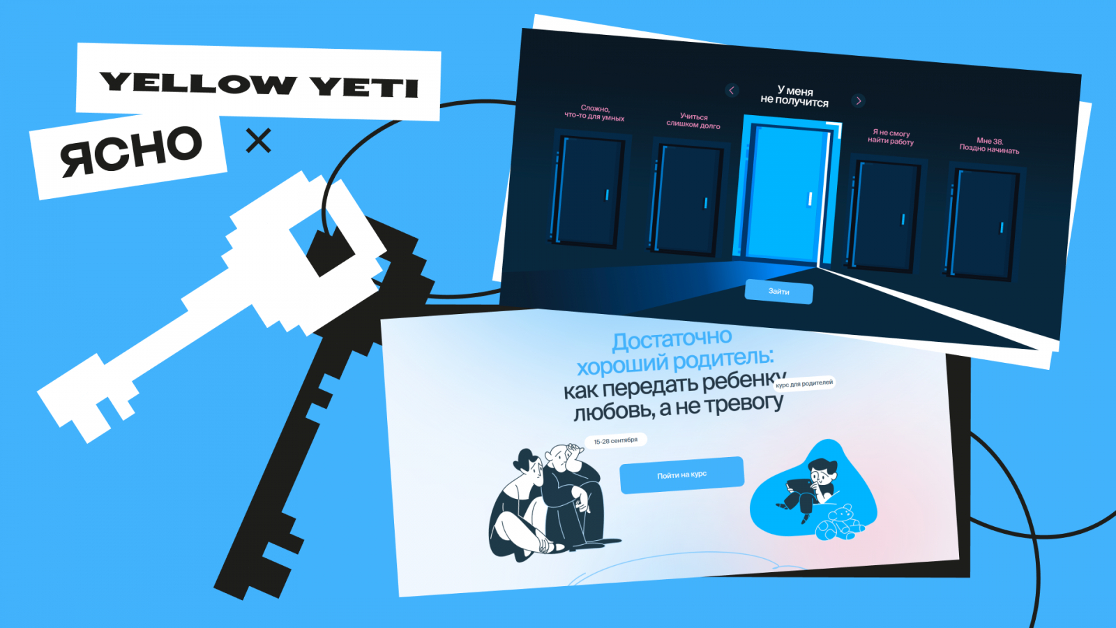 Ссылка в рекламе вела на лендинг, где нужно открывать двери со своими страхами, например: «Я не смогу найти работу» или «Мне 38. Поздно начинать». За дверью ты попадаешь на страницу, где психологи Ясно объясняют страх и как его преодолеть. А в конце — промокоды со скидками на сессию с психологом в Ясно и обучение в Яндекс Практикуме.