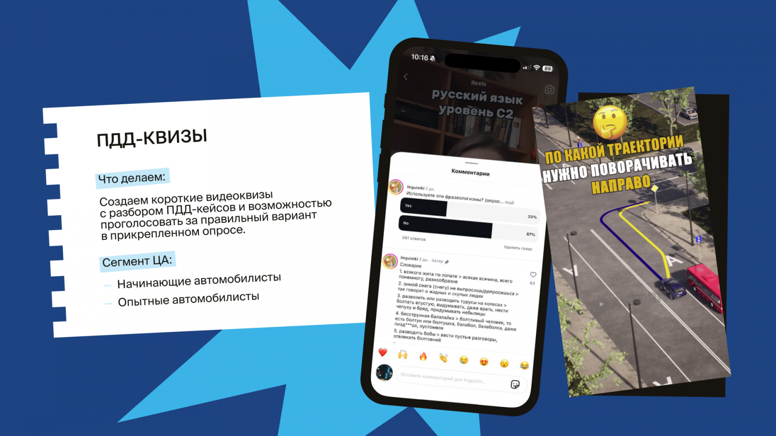 Для каждой категории мы поделили темы на познавательные и развлекательные. Но в развлекательных старались не уходить далеко от страхования, чтобы не отпугнуть новых подписчиков. Иначе кто-то может не разобраться — что здесь вообще происходит? Слишком внезапные шутки можно позволить, если у компании уже сложился свой узнаваемый стиль контента, который зрители смогут вспомнить даже при неожиданных заходах.