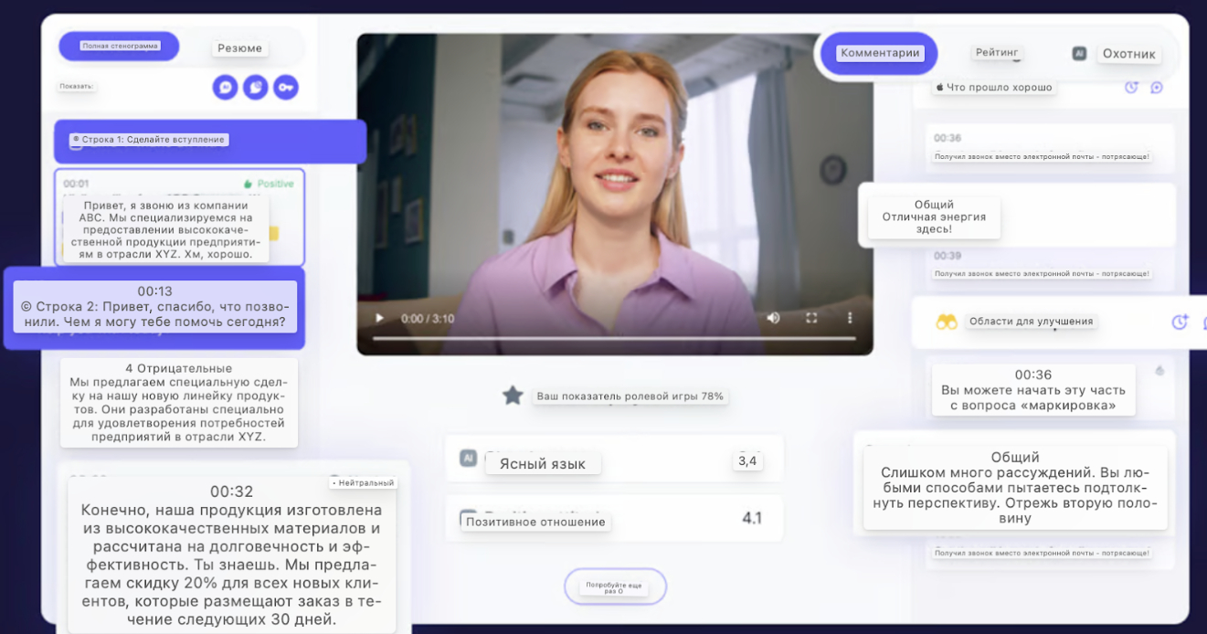 Нейротренер — это AI-платформа, которая моделирует реальные переговоры с клиентами, оценивает навыки менеджера и дает рекомендации по их улучшению. Такое обучение происходит в безопасной среде, без риска упустить сделку, потерять время и репутацию компании в ходе реальных диалогов новичка, пока тот еще не до конца освоился.