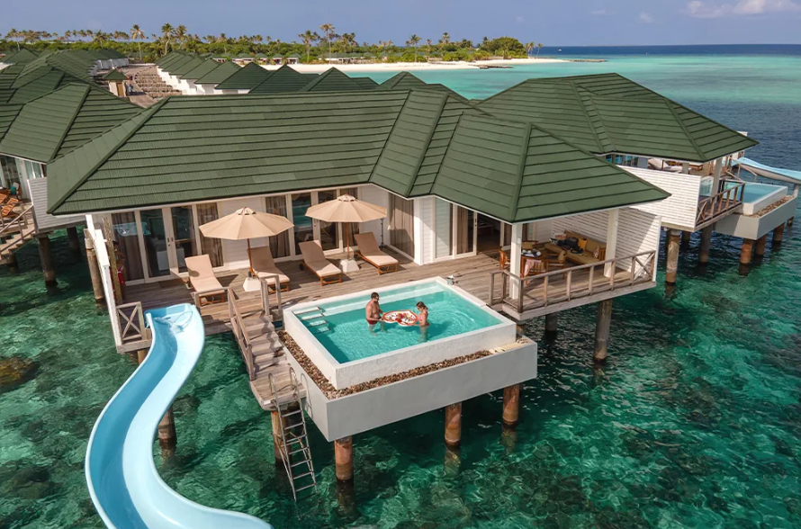 Отель предлагает более 400 номеров, разделенных на 21 категорию — от уютных водных вилл до роскошных трехспальных резиденций. Все номера — с личным бассейном.
