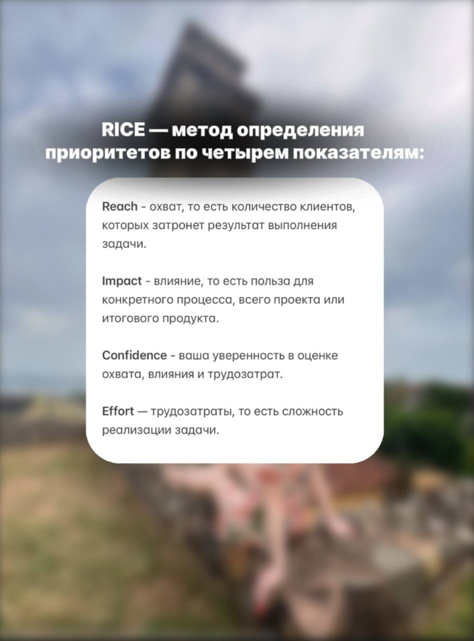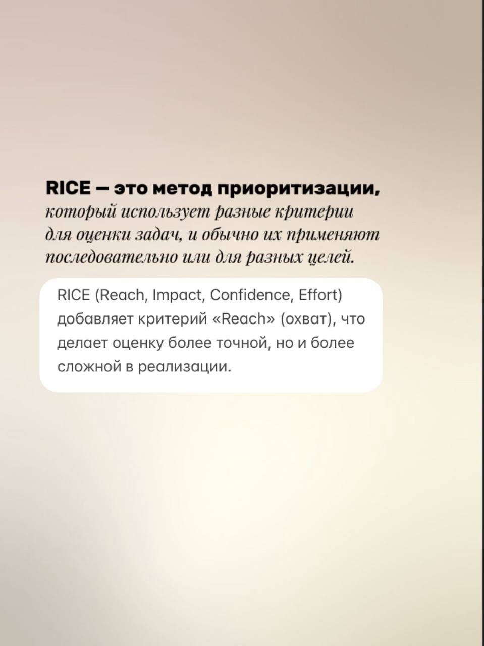 RICE — это метод приоритизации, который используют разные критерии для оценки задач, и обычно их применяют последовательно или для разных целей.