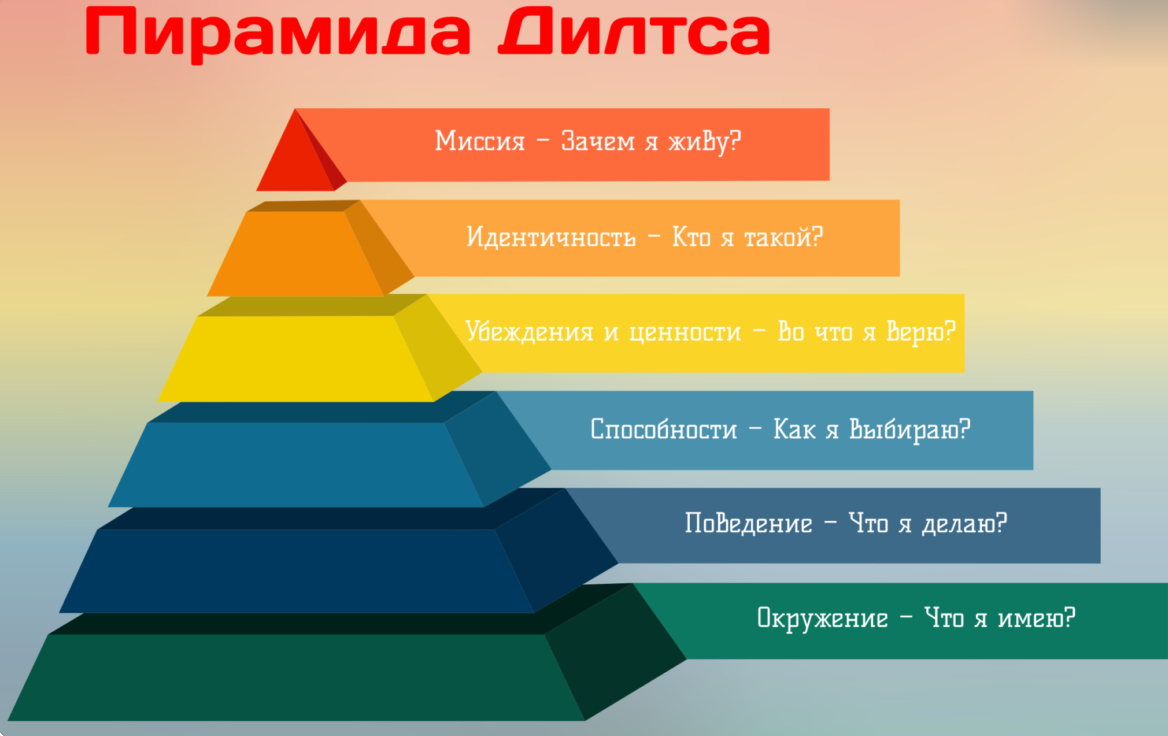Многим известна пирамида логических уровней Роберта Дилтса (он изучал взаимодействие между разными группами людей и выделил различные уровни, к которым относится человек или группа), но давайте разберемся, как нам ее использовать в нужном нам контексте.