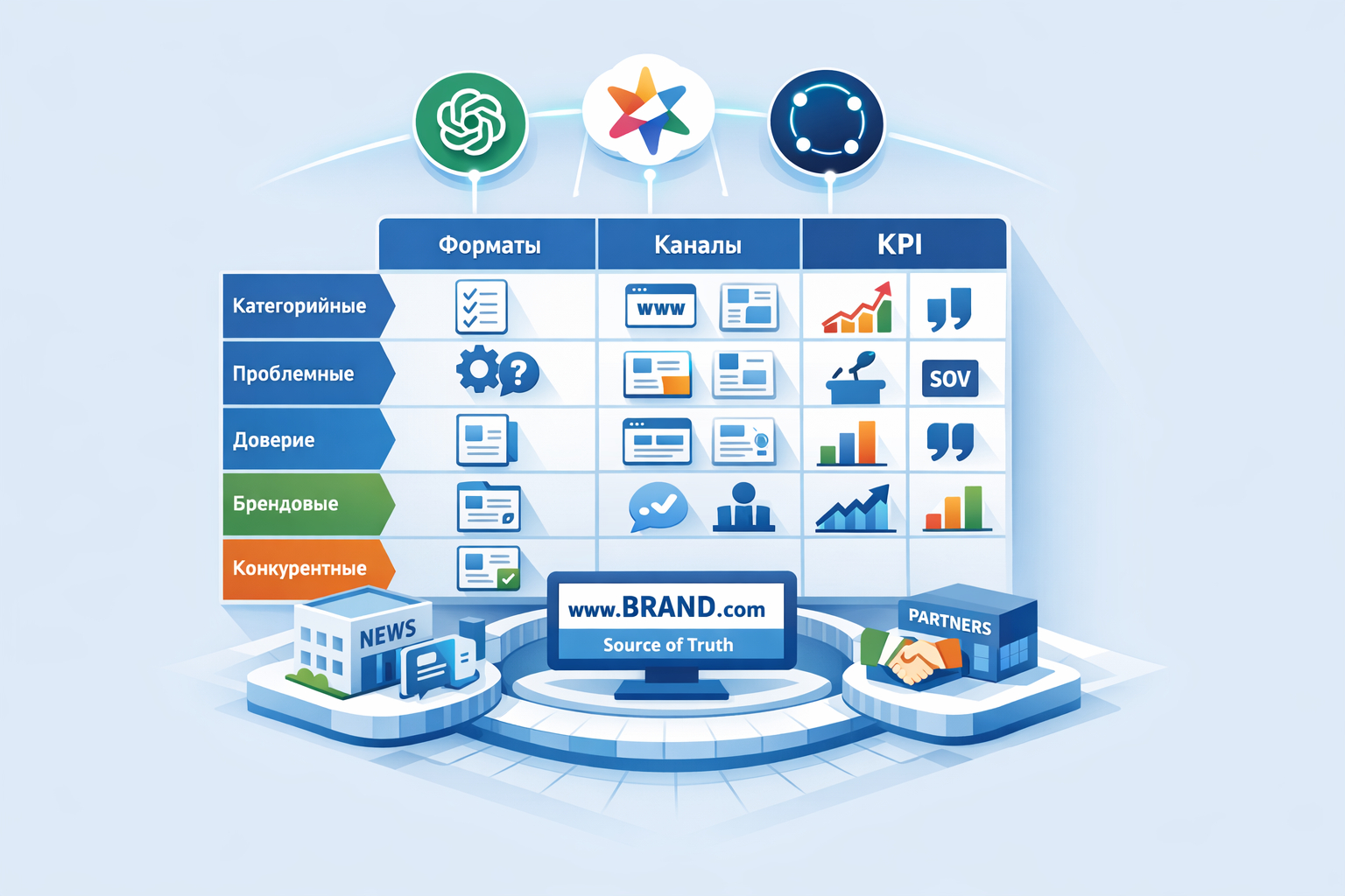 Начинают не с тем, а с намерений. В матрице удобно держать 4–5 групп запросов, которые чаще всего приводят к упоминанию бренда в генеративном поиске.