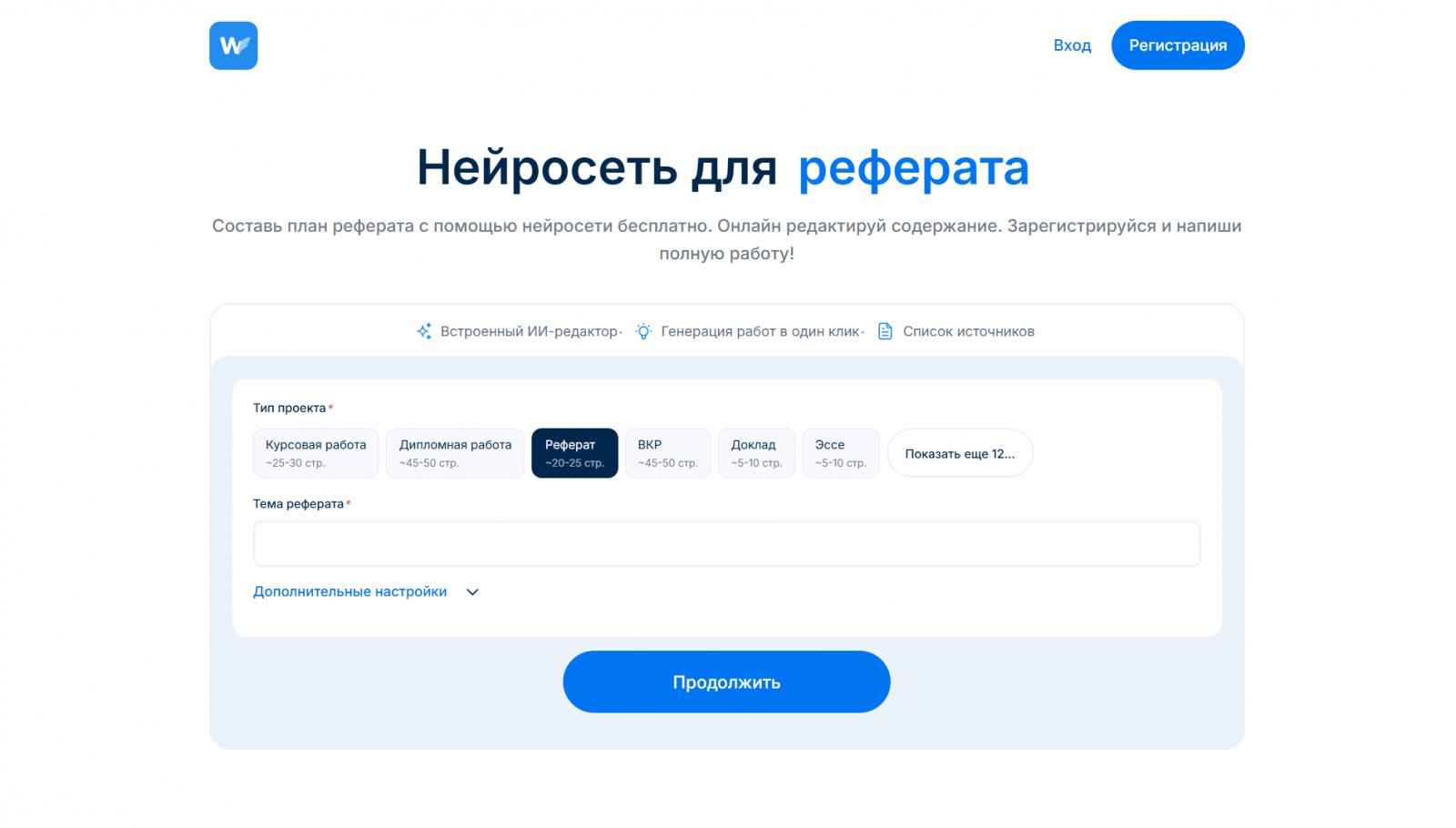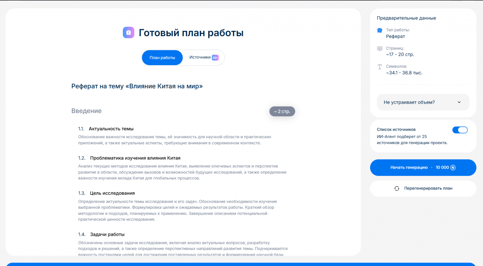 Такой помощник — Wordybot — умная нейросеть для написания рефератов онлайн. В отличие от обычных чат-ботов, выдающих фрагментарные ответы, сервис работает как персональный академический ассистент. Он выстраивает полноценную исследовательскую работу: с введением, где прописаны цели и задачи, с логично структурированной основной частью и выводами, которые действительно подводят итог. При этом всё идёт поэтапно: сначала система бесплатно показывает вам детальный план, вы можете его откорректировать, и только после запускается генерация финального текста.