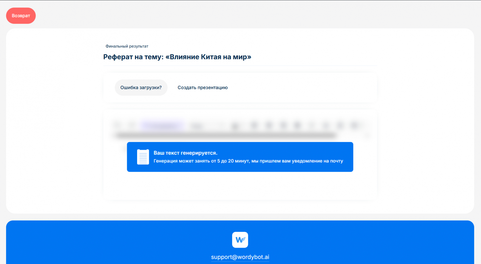 Весь процесс длится от 5 до 20 минут в зависимости от объема. Можно дождаться завершения прямо на странице или закрыть вкладку — сервис пришлёт сообщение на почту, когда реферат будет полностью готов.