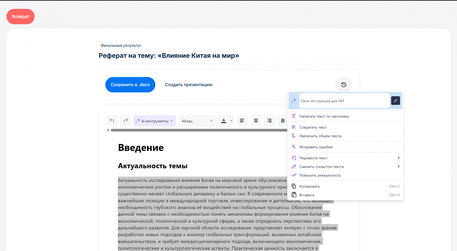 Платформа делает написание реферата не только оперативным, но и контролируемым: вы следите за каждой стадией — от планирования и структурирования до окончательной редакции. Больше не нужно тратить дни на сбор литературы и компоновку текста — искусственный интеллект помогает создавать работы онлайн быстро, при этом сохраняя ваш индивидуальный авторский почерк.