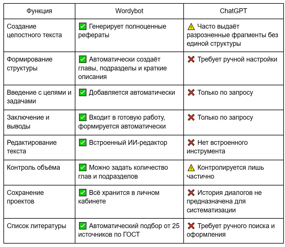 Чтобы продемонстрировать преимущества платформы, сравним её с популярными чат-ботами вроде ChatGPT: