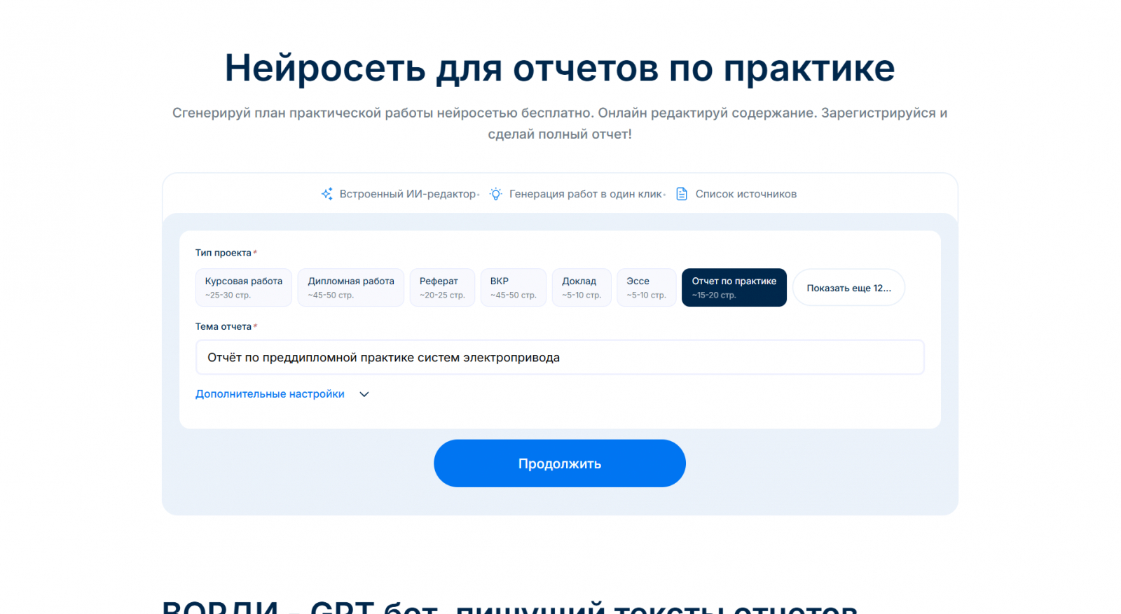 Wordy — это универсальный AI-помощник для создания длинных и структурированных текстов. Он не ограничивается только отчетами по практике и подходит для самых разных задач.