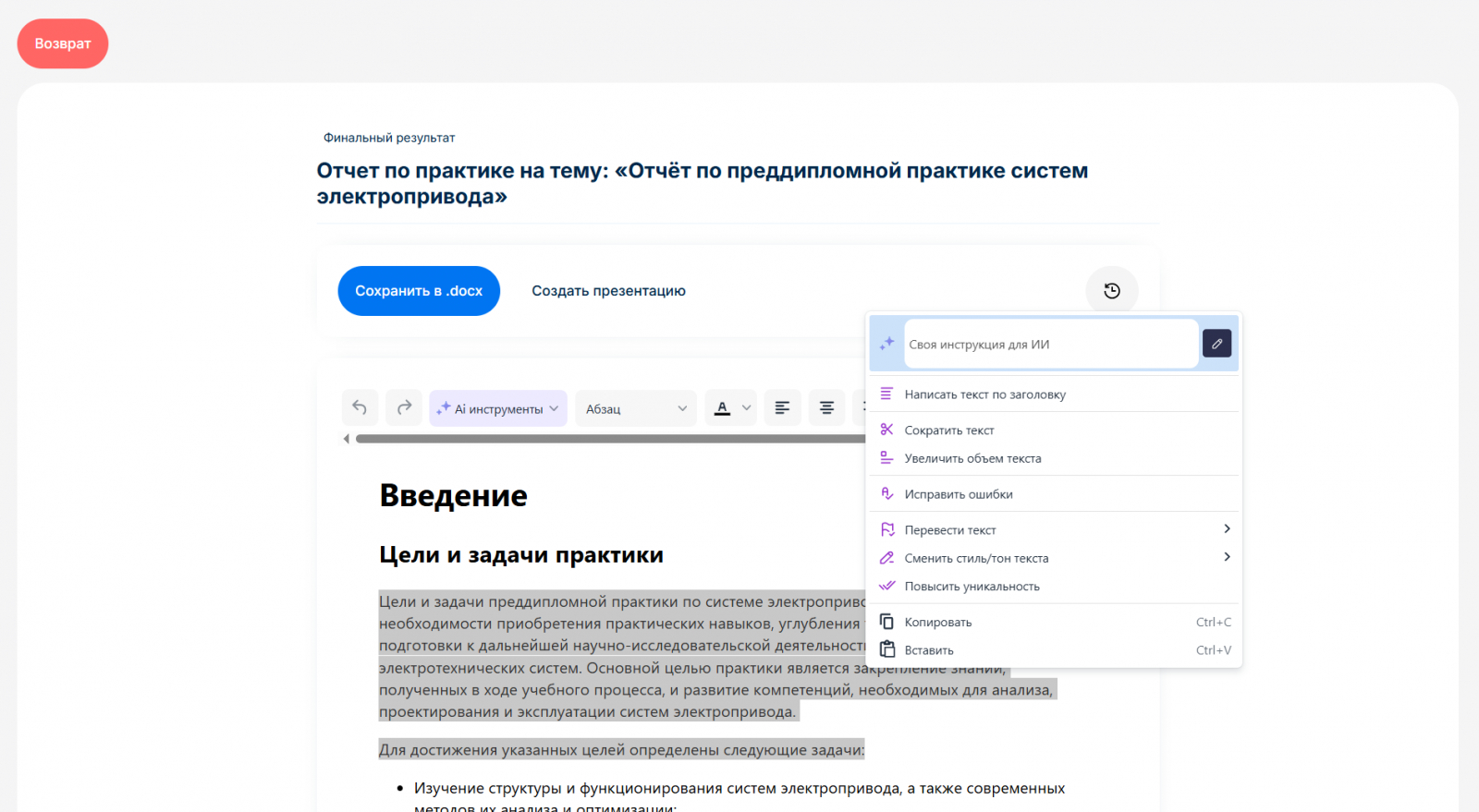 На выходе вы получаете полностью готовую работу, которую можно скачать в формате .docx. Однако при необходимости отчет легко доработать прямо внутри сервиса с помощью встроенного ИИ-редактора. С его помощью можно: