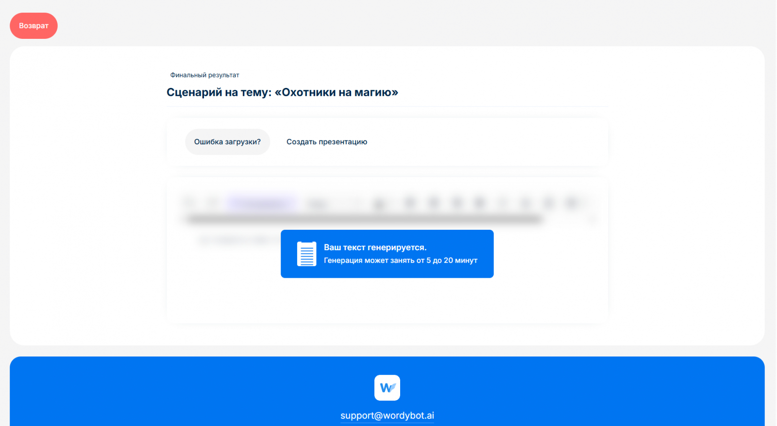 Главная особенность сервиса — пошаговое создание. Сначала нейросеть предлагает детально продуманный план, с помощью которого можно заранее оценить объём и согласовать содержание. Только после утверждения этого этапа начинается основная генерация текста от завязки и конфронтации до кульминации и выразительной развязки. Такой формат помогает сохранить авторский замысел, делает процесс прозрачным и даёт полный контроль над результатом. Wordy не пишет за вас — он помогает создавать вместе с вами. Вы остаетесь автором, а искусственный интеллект становится надёжным и вдохновляющим партнёром.