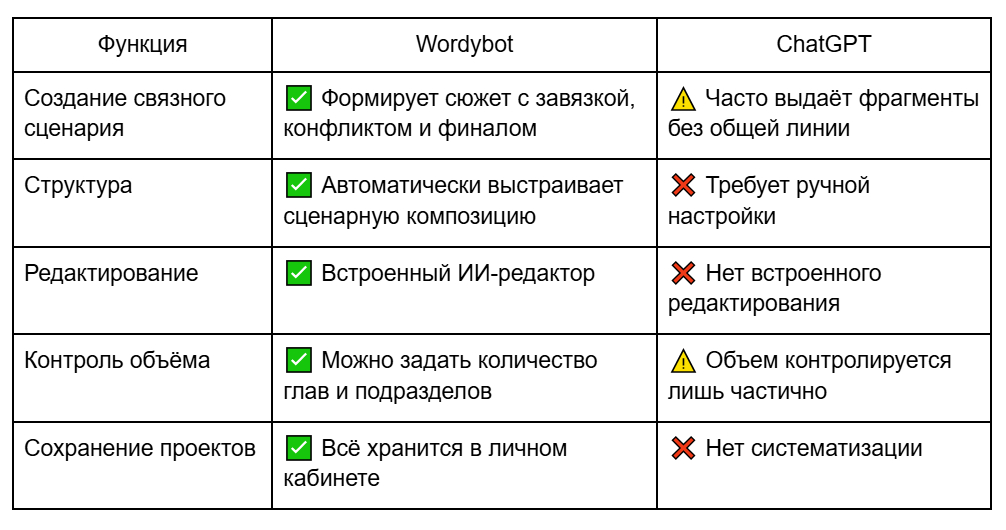 Wordy не просто чат, где ИИ отвечает на запросы, а полноценный соавтор и редактор, который следит за логикой повествования, стилем, ритмом и плавностью переходов между сценами. Ведь хороший сценарий — это не набор отдельных реплик, а единое произведение, где каждая сцена ведёт к следующей и действия подчинены общей идее.