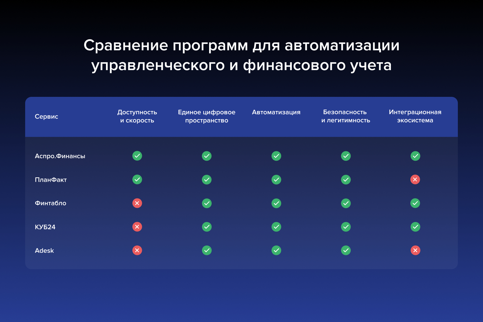 Для сравнения мы отобрали пять решений в области автоматизации управленческого и финансового учета: Финтабло, ПланФакт, КУБ24, Adesk и Аспро.Финансы. Наши рекомендации по выбору — наглядно в таблице.