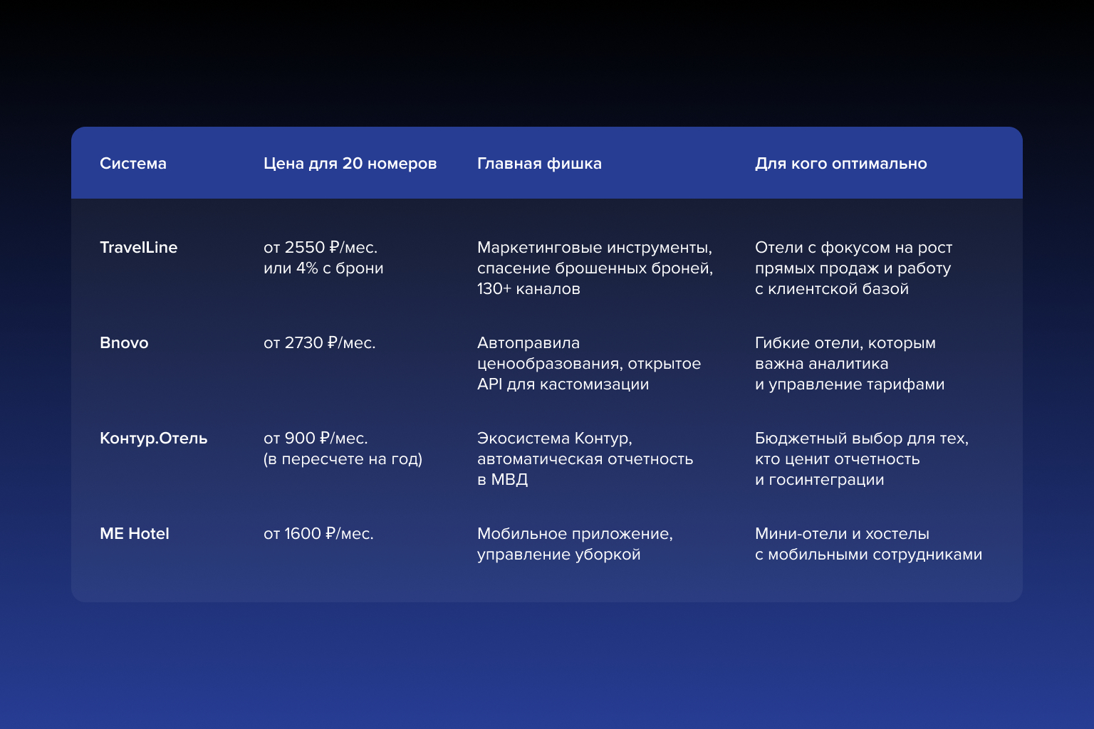 О чем материал: Практический обзор с фильтром на малый и средний бизнес. Разбираем, какой функционал критичен, а за что не стоит переплачивать, сравниваем модели ценообразования и даем таблицу с конкретными цифрами для отеля на 20 номеров.