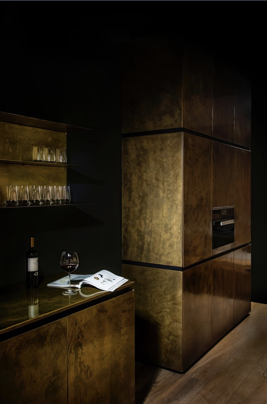 Например, кухонный фасад из цельнолитой бронзы был бы невероятно тяжелым и дорогим. Но если взять МДФ или гипс и покрыть их жидким металлом, получится тот же визуальный эффект — монолитная бронза с благородным блеском, только легче, доступнее и практичнее.