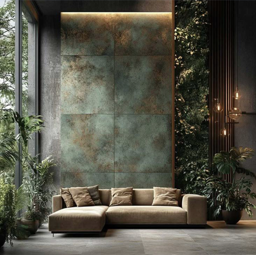 Глубокий блеск и богатая фактура превращают привычные материалы в цельнолитые металлические объекты. Так работает технология жидкого металла: бетонная колонна или гипсовая панель начинают выглядеть так, будто они отлиты из бронзы или меди.
