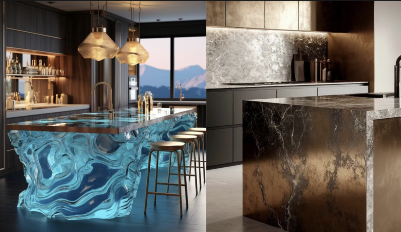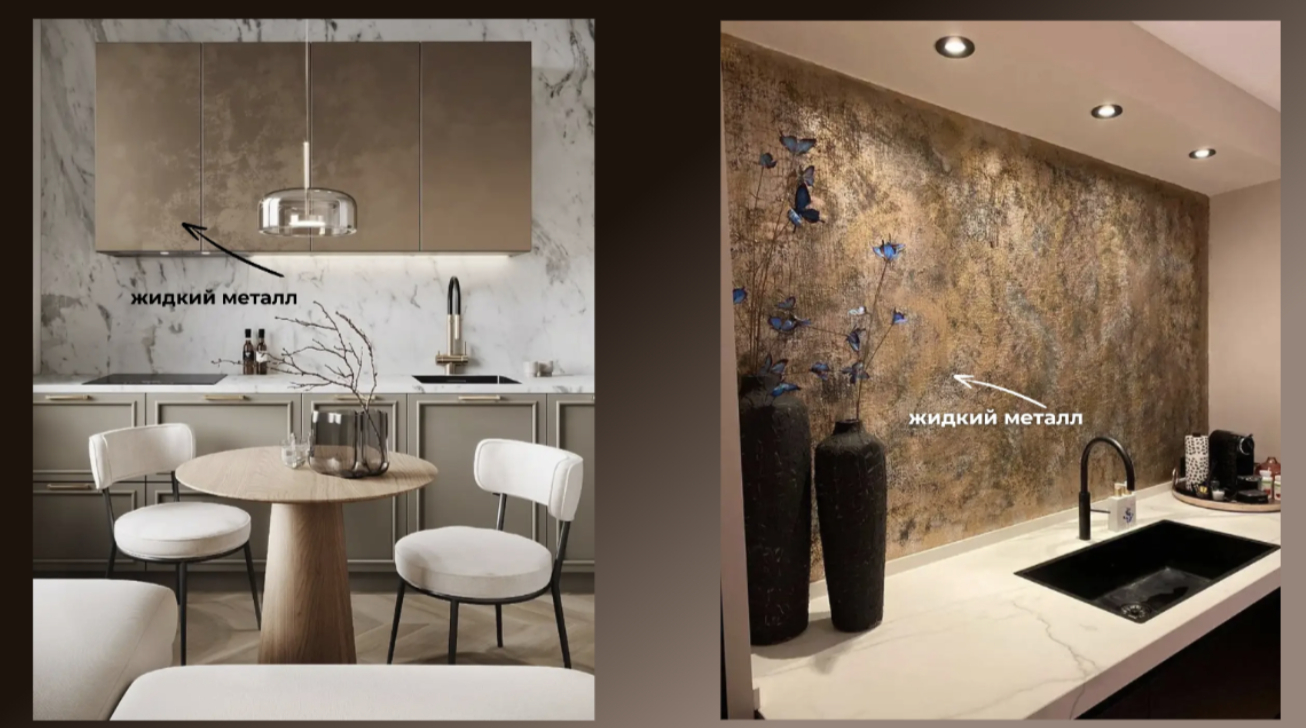 Жидкий металл — эффектный, благородный, статусный материал с уникальной визуальной глубиной. Но он требует аккуратности и не рассчитан на жесткую кухонную эксплуатацию.