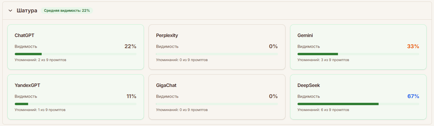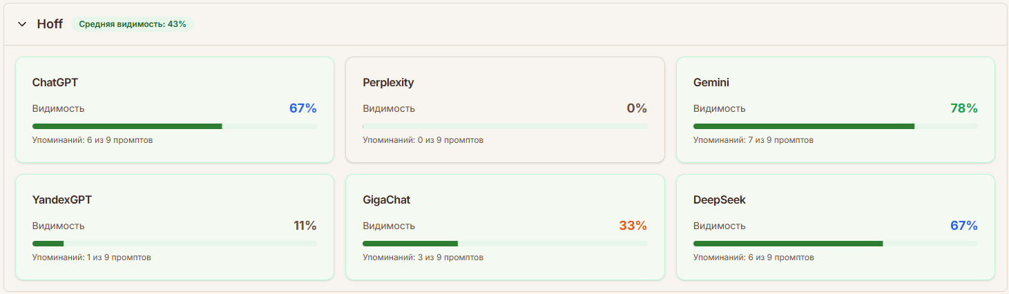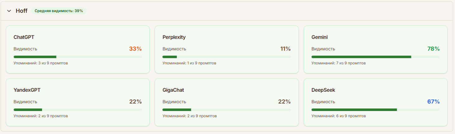 Вывод: Gemini видит Hoff в 2.4 раза чаще, чем ChatGPT. Если вы оптимизируетесь только под ChatGPT — упускаете 70% аудитории Gemini.