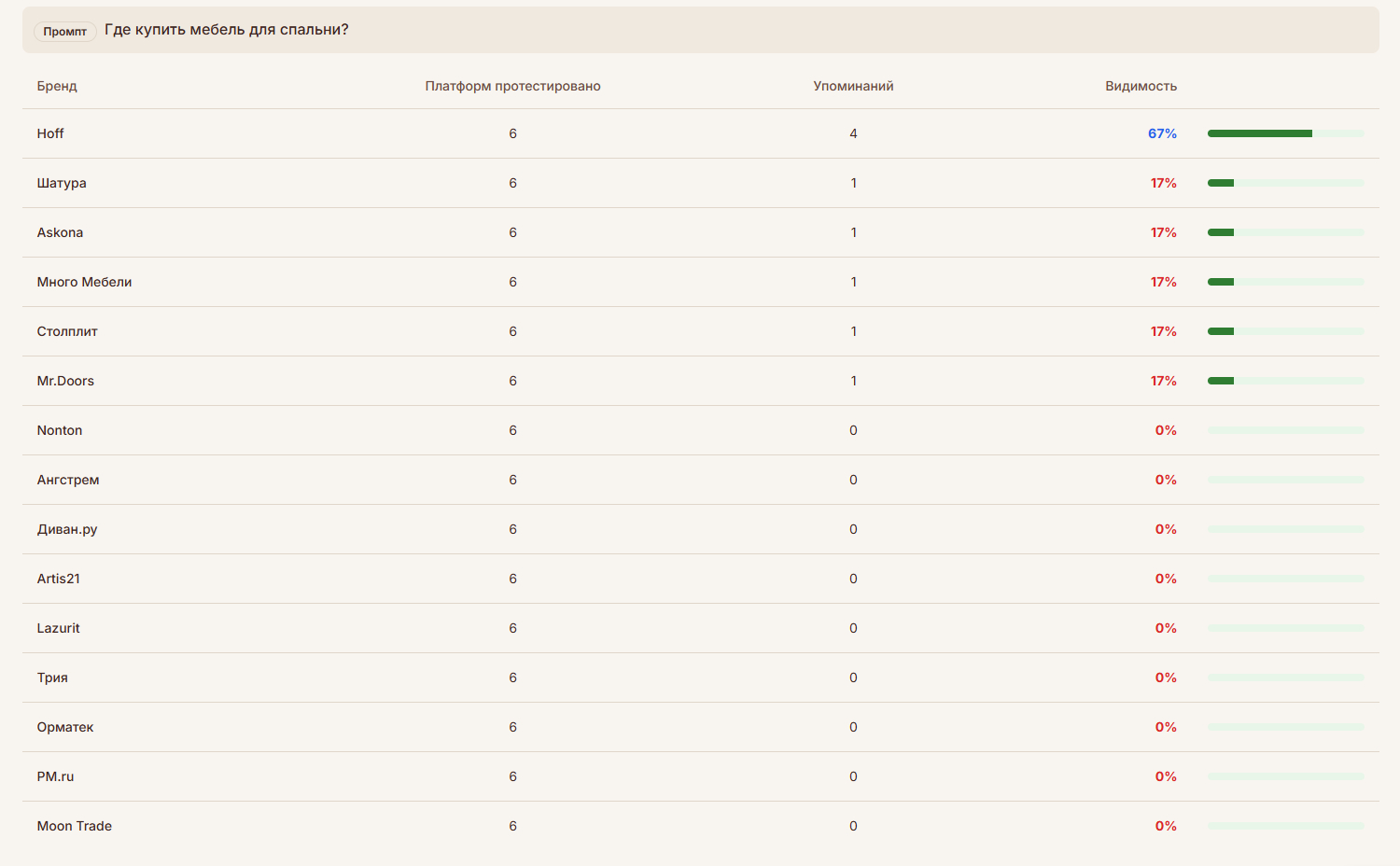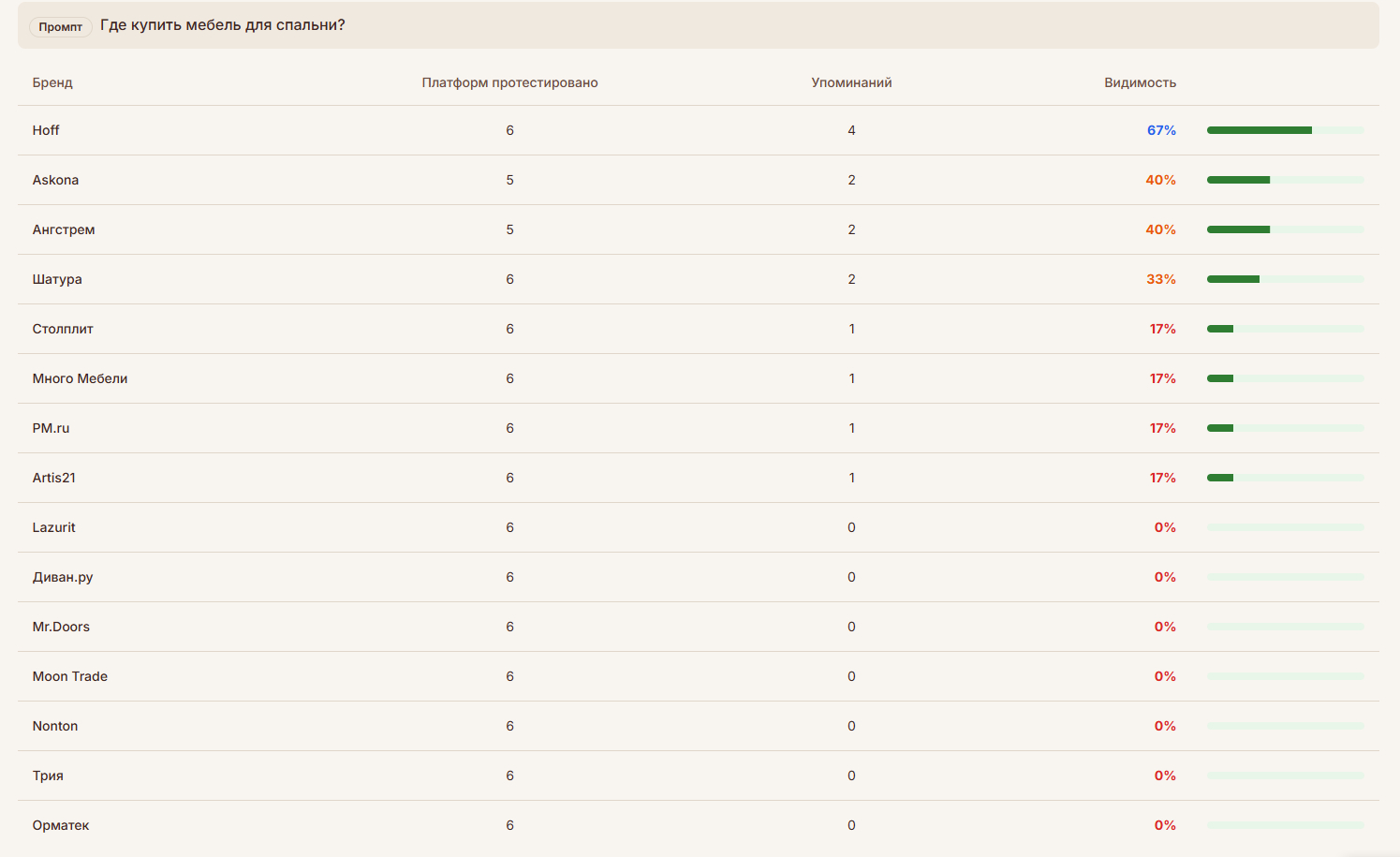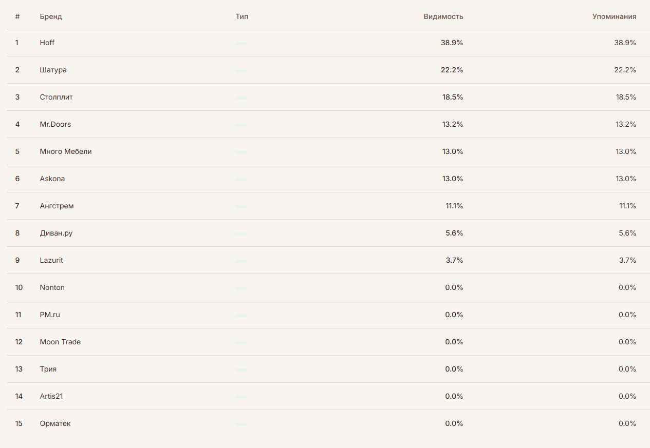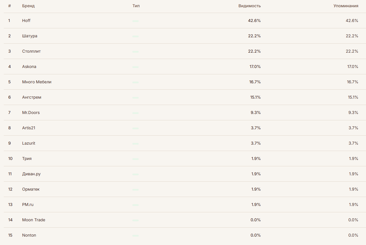 Мы спросили ChatGPT, Gemini и другие нейросети о 15 мебельных брендах. Hoff лидирует везде, но в Петербурге рейтинг вообще меняется - Mr Doors проваливается, а Askona прорывается в топ-5.