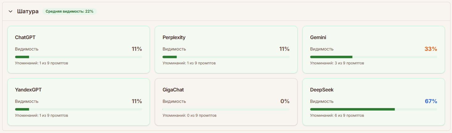 Протестируйте бренд в ChatGPT, Gemini, YandexGPT для ваших ключевых городов.