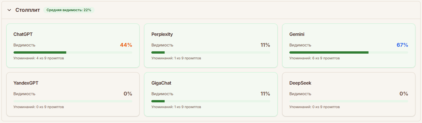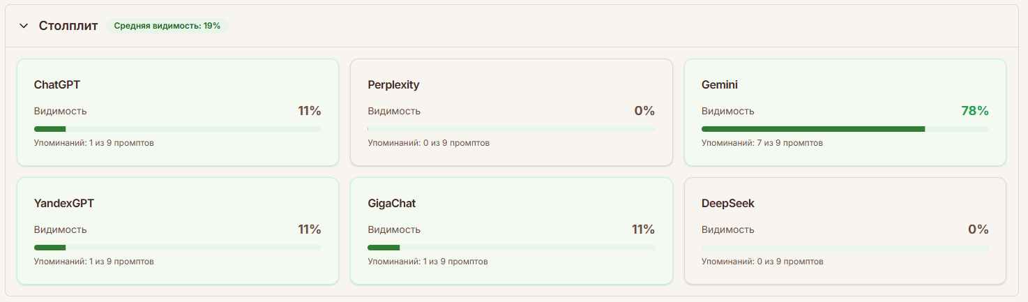 Вывод: Столплит почти полностью зависит от Gemini. Если модель изменит алгоритм - бренд потеряет 80% видимости.