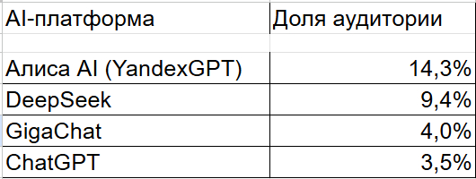 По данным [Mediascope] за октябрь 2025 года, распределение аудитории AI-сервисов в России: