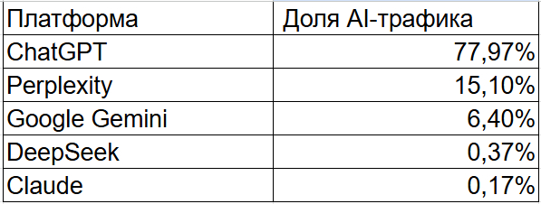 Что это значит для маркетологов: нужно присутствовать минимум в 4-5 AI-платформах, чтобы охватить всю аудиторию. Делать ставку только на ChatGPT — ошибка.