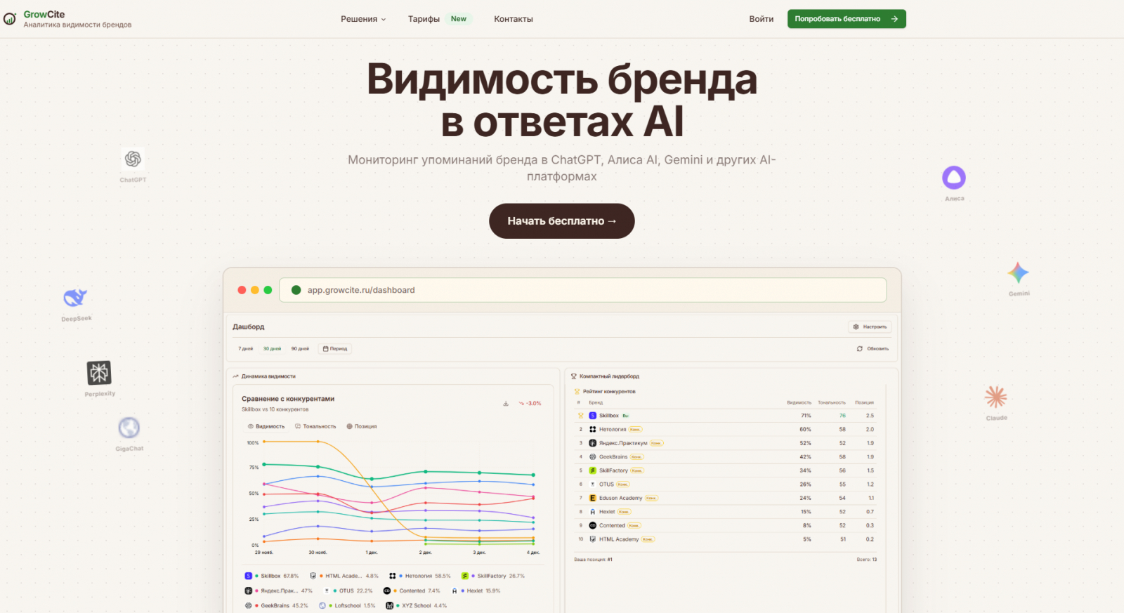 GrowCite — российская платформа для мониторинга видимости брендов в AI-чатах. Ключевое преимущество и главный дифференциатор — полная поддержка российских нейросетей: Алиса AI, GigaChat.