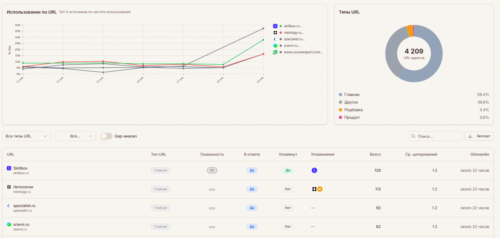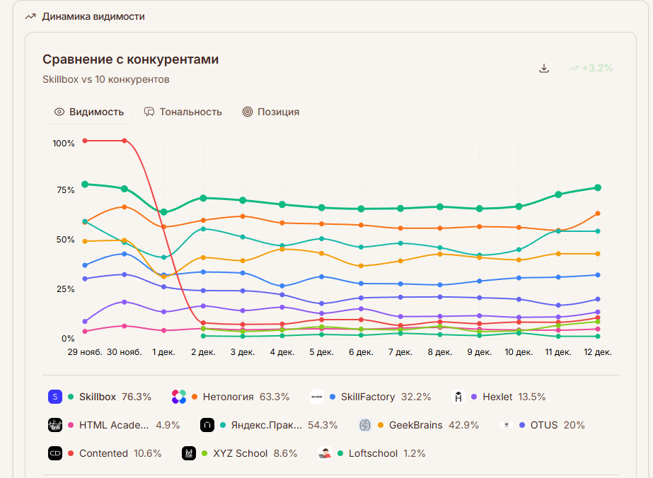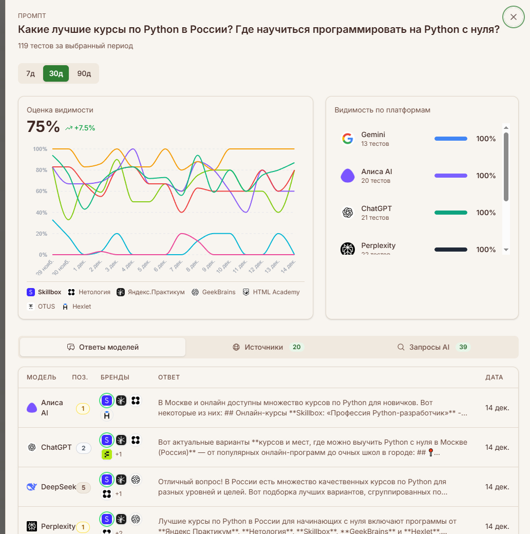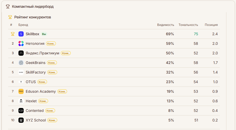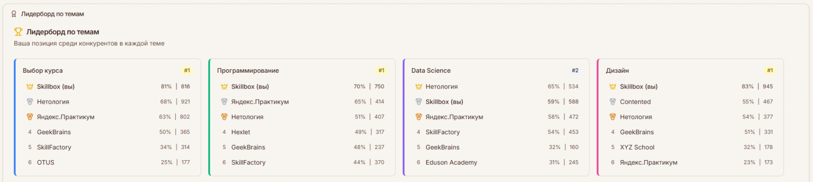 - Лидерборд по темам — ранжирование брендов по видимости в разных тематических категориях запросов (например: "выбор курса", "программирование ", "дизайн")