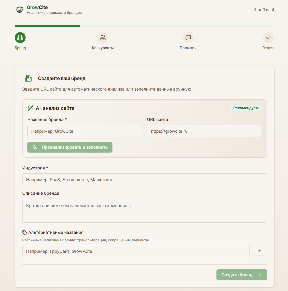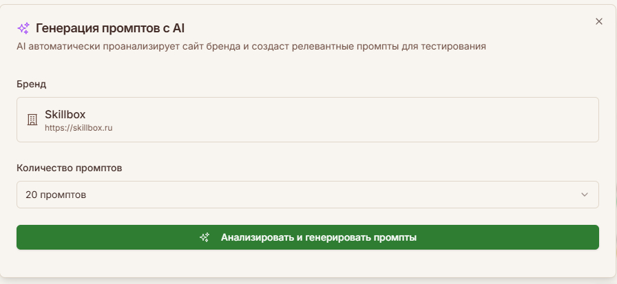 Автоматически после регистрации анализирует бренд, создает описания, промпт, конкурентов , список можно корректировать.