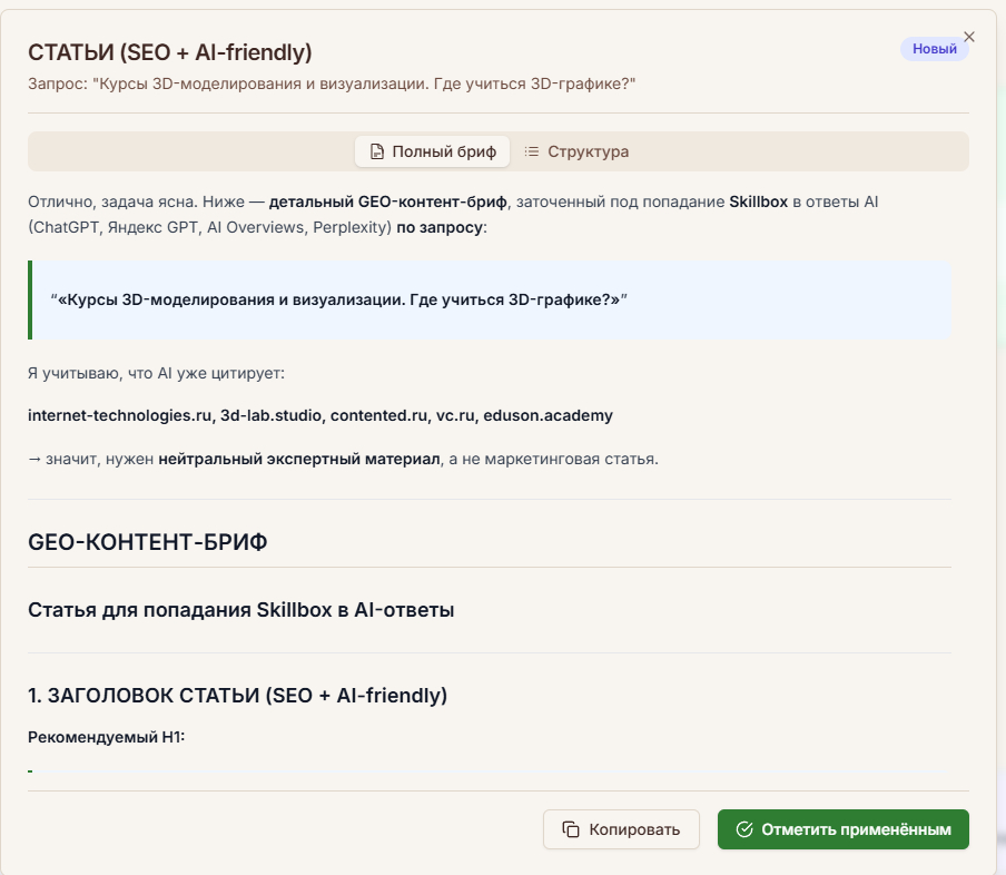 Генерирует ли сервис готовый бриф для создания статьи, на основе источников, если бренд не упоминается в ответе ai ассистента