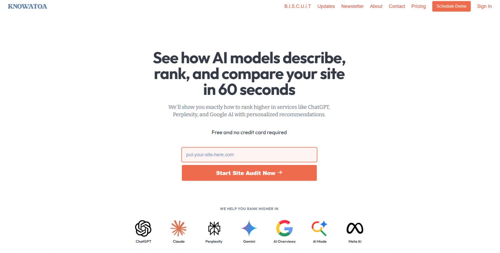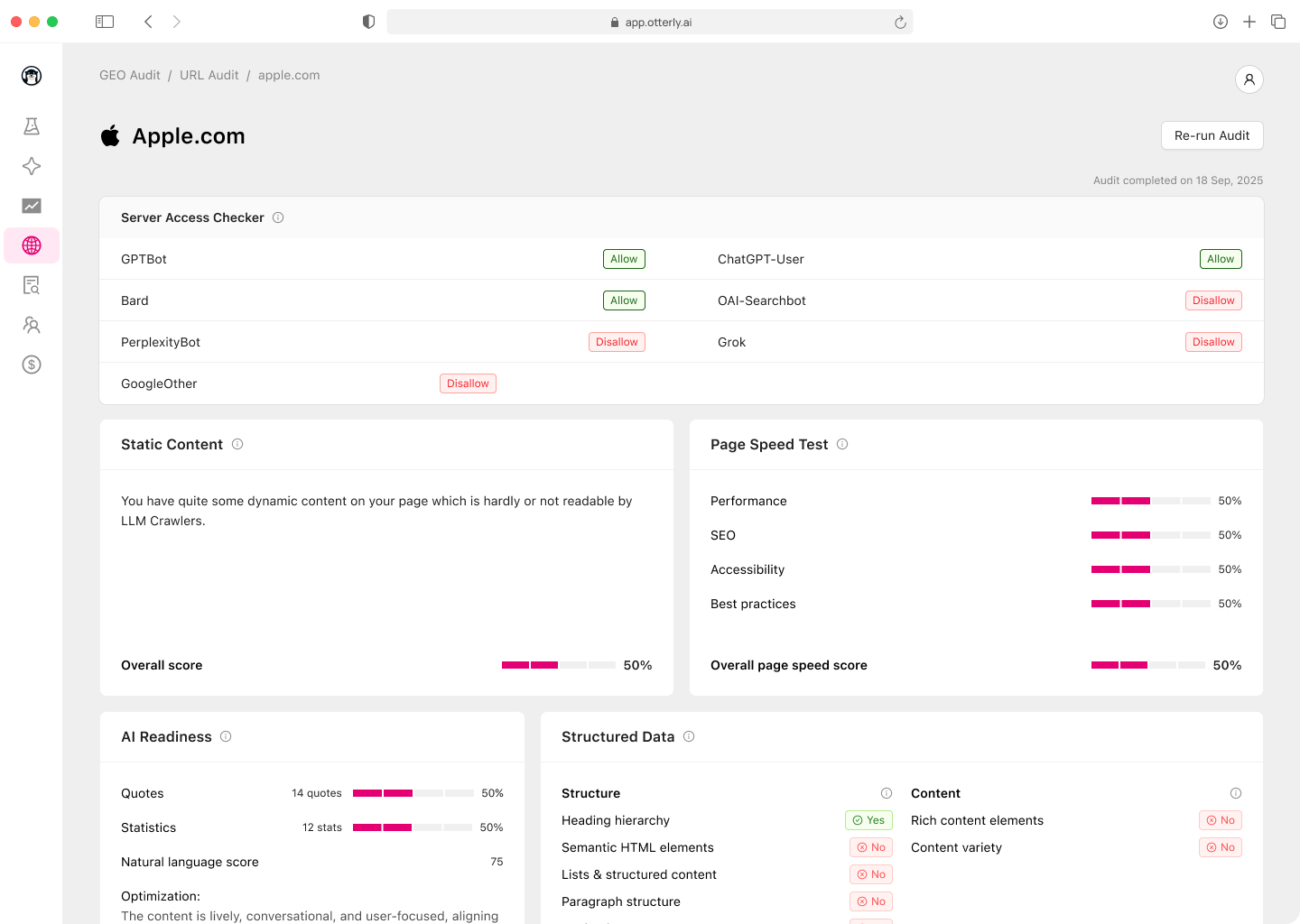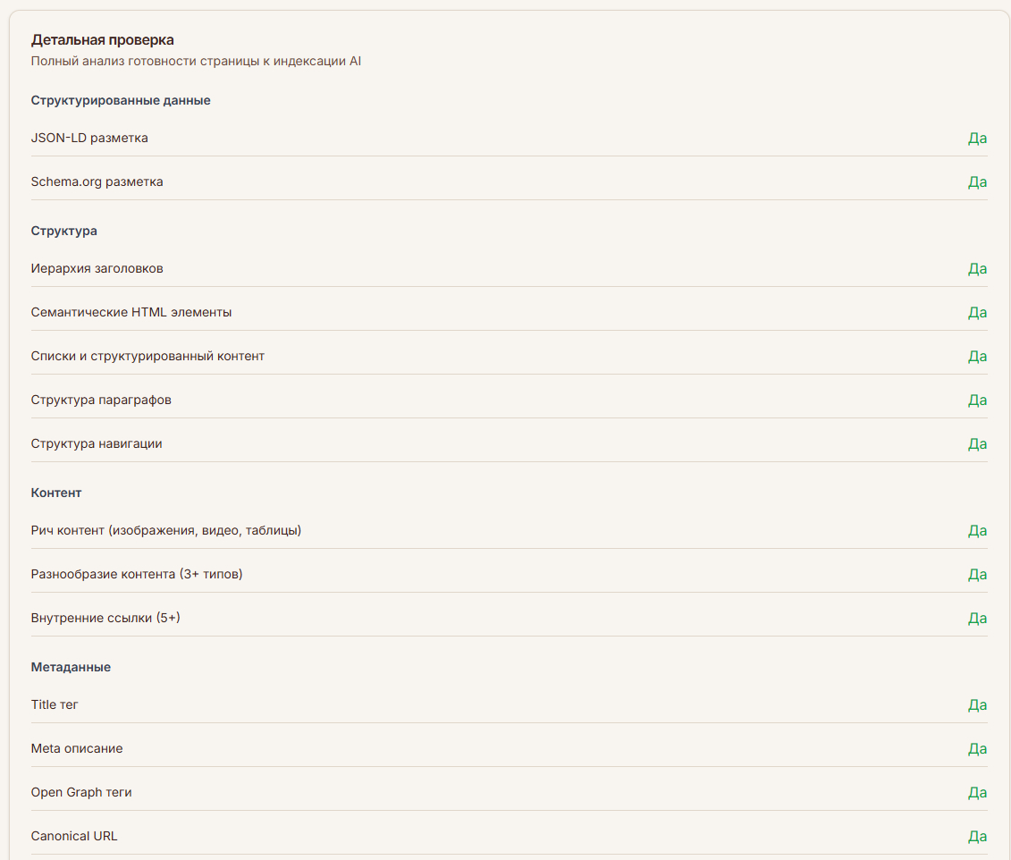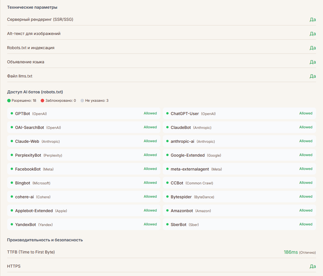 Проверка технической готовности сайта к AI-индексации: наличие Schema.org, llms.txt, правильная структура контента, мета-теги, может ли вообще получить информацию о вашем сайте и т д.