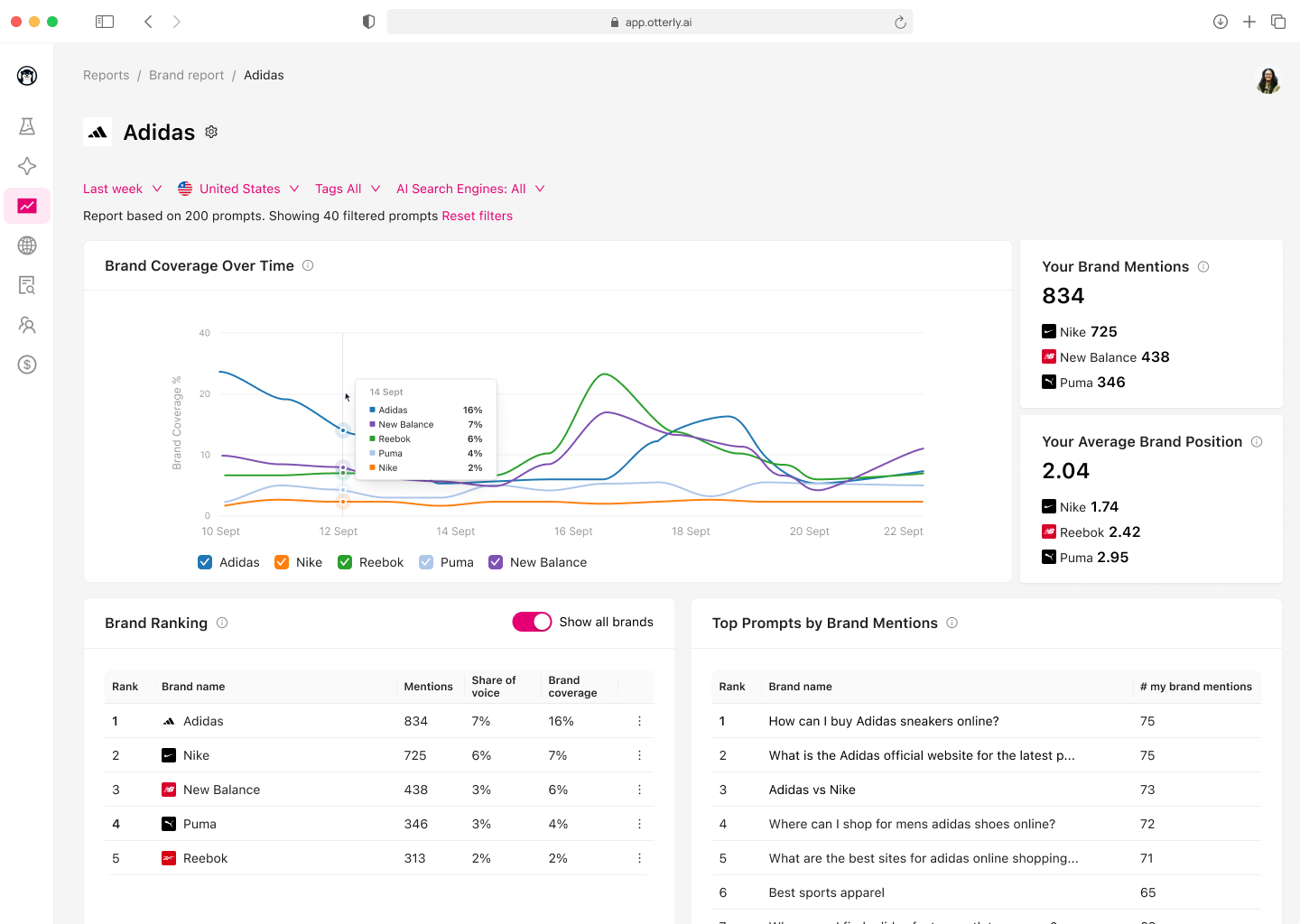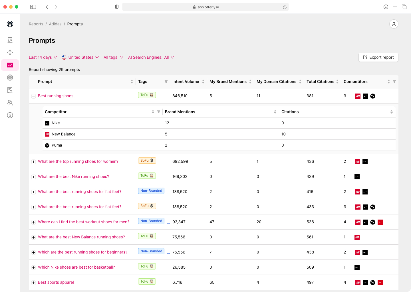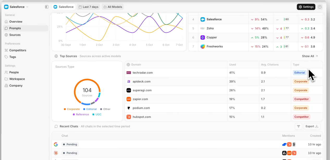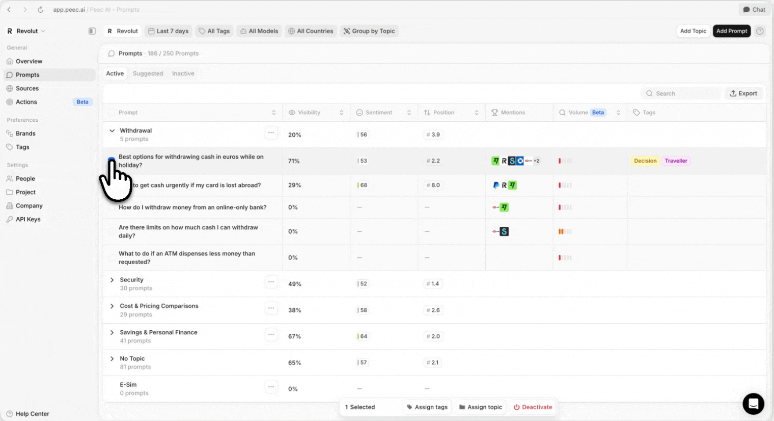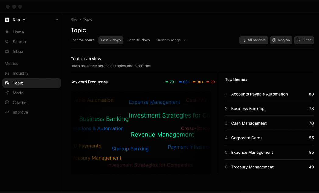 - Строят лидерборды как в целом по вашему бренду в сравнении с конкурентами, так и по темам / категориям. Это можно использовать как долю голоса в конкретной теме / продукте. Так как если просто в прямом сравнении у бренда видимости 70% , то в разрезе тем видимости может и не быть по определенной теме - что дает шум в данных и не правильную интерпретацию . В SEO , например, при продвижении используют кластеризацию запросов - это похожая механика. В тему вы объединяете все запросы / промпты по смыслу , чтобы был единый intent.