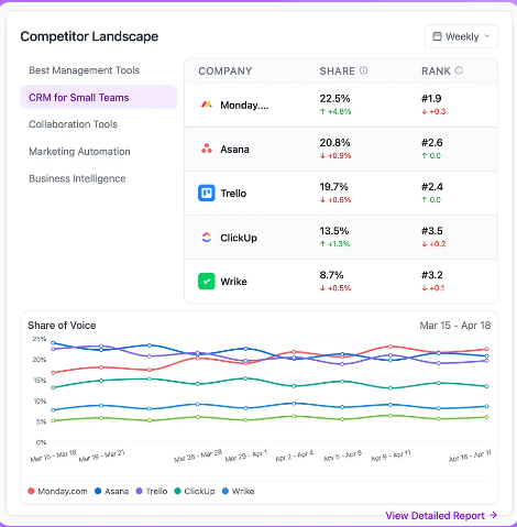 - Лидерборд по конкурентам — сравнительный рейтинг всех конкурентов по ключевым метрикам: частота упоминаний, позиция, тональность