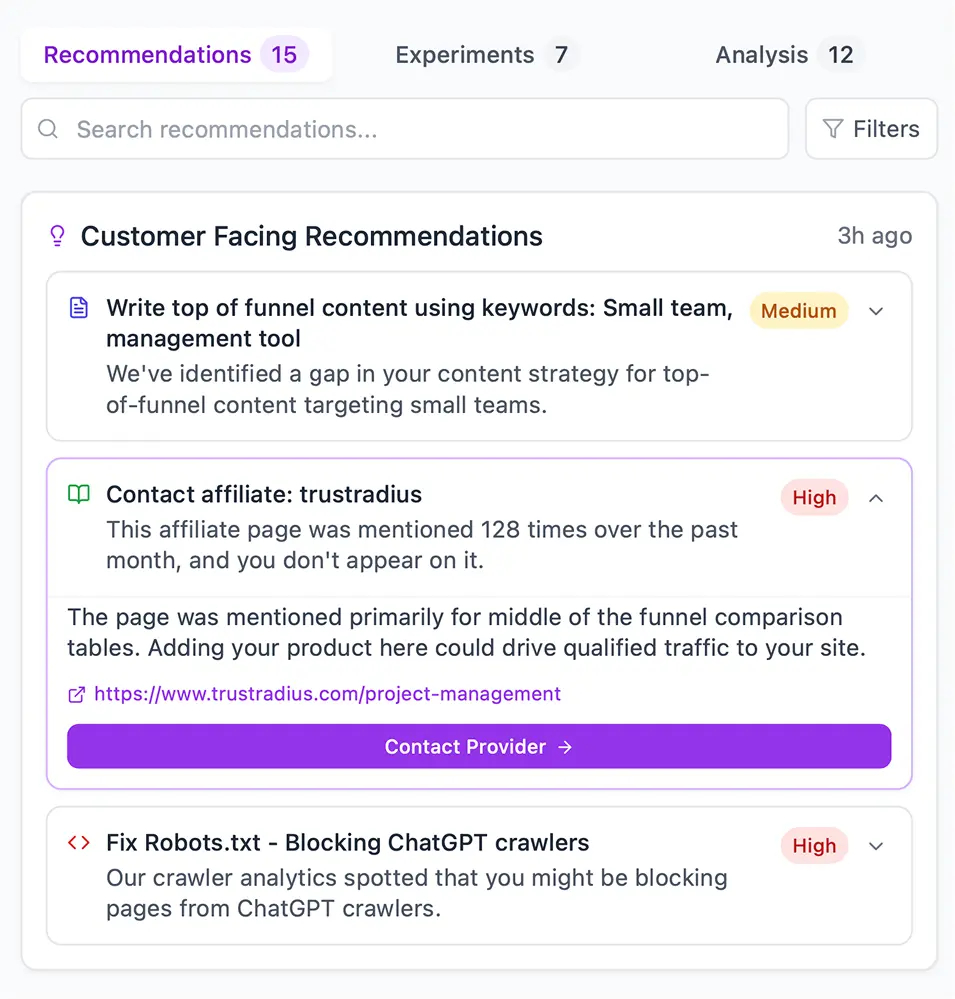 - Генерация брифов - для создания статей, если бренд не упоминается. Оценивает видимость в ответах , источники, которые были использованы и на основе генерируется бриф, чтобы бренду помочь в попадание в рекомендации AI ответы.