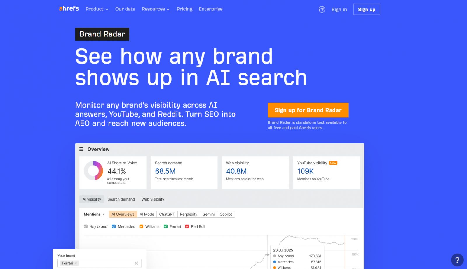 5. Для пользователей SEO-платформ — модули Ahrefs Brand Radar или Semrush AI Visibility