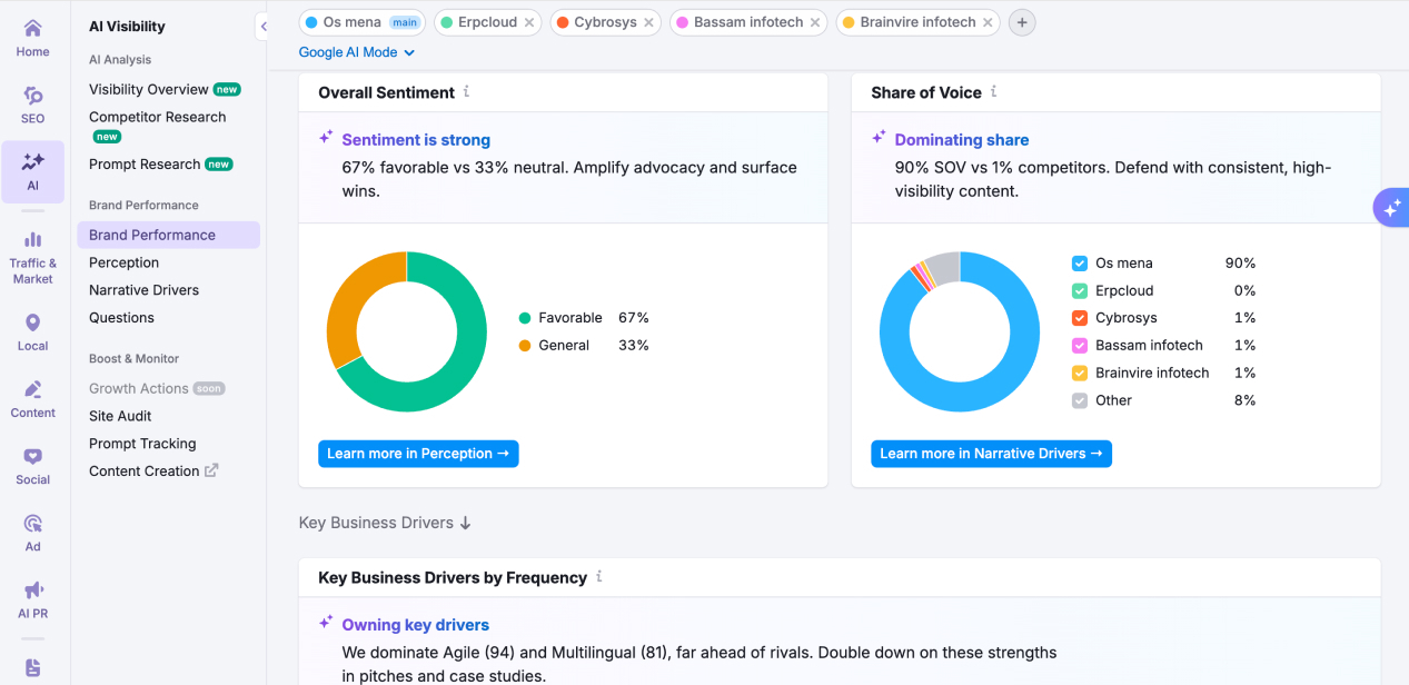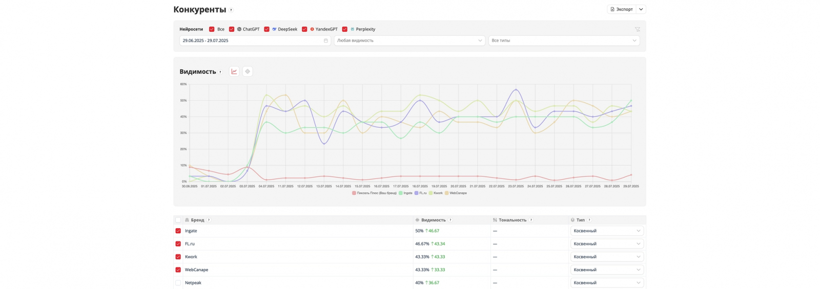 - Видимость бренда — как часто AI упоминает ваш бренд, в SEO метрику можно сравнить с показами